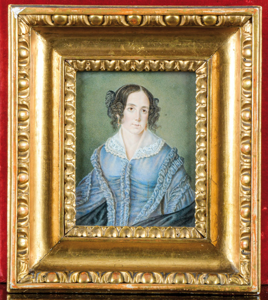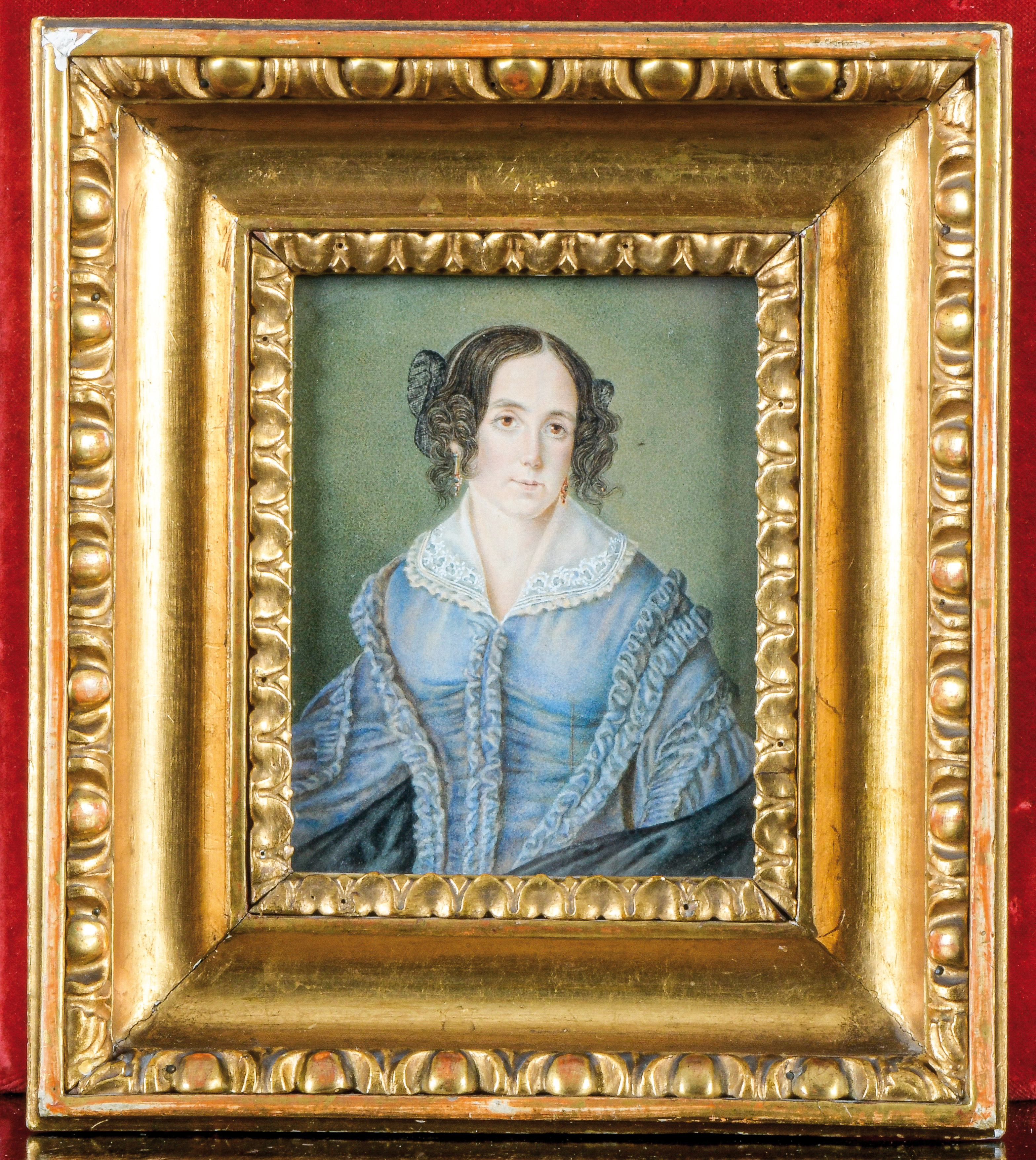 - Katalog-Nr: 26Wiener Miniaturist des 19. Jhs. Porträt einer Dame in blauem Kleid. Bunt gemalt in Puderfarben und aquarelliert auf Papier, hi./Gl. in aufwendig stuckiertem Holzrahmen, auf Kreidegrund gold gefasst (13 x 9,6 / 23,5 x 20,5 cm). (min. best.). Provenienz: Antiquitäten Gertrud Rudigier, München 1983.o.L.
