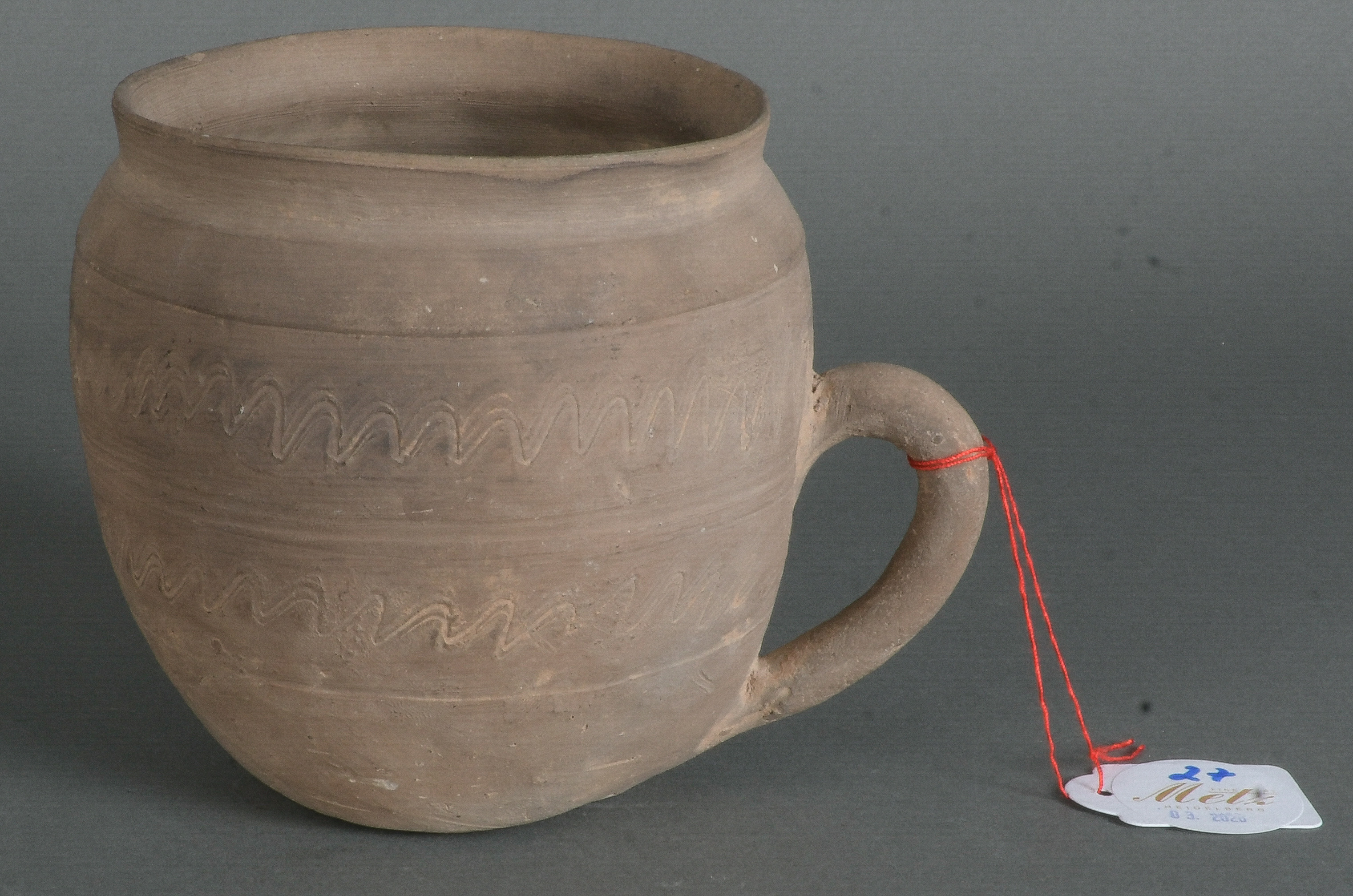 - Katalog-Nr: 27Henkelbecher. Japan / Korea, Kofun-Dynastie ca. 250 - ca. 552 n. Chr. Steinzeug, hellgrauer Scherben, unglasiert, mit anmodelliertem Henkel und Ritzdekor in Form zweier horizontal verlaufender Wellenbänder, H=11 cm. Provenienz: Sammlung Prof. Dr. Peer Hultberg (1935-2007), Hamburg.o.L.