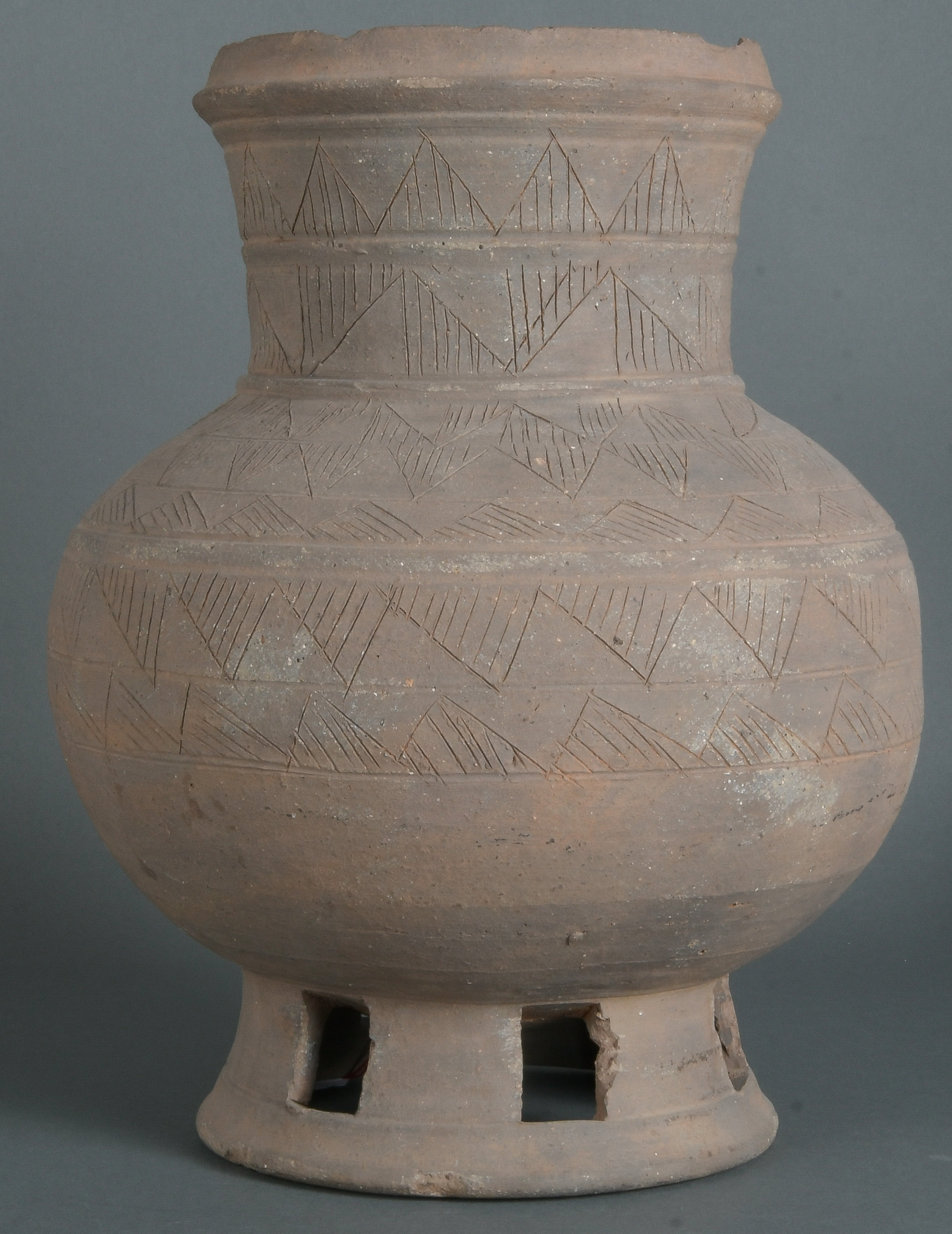 - Katalog-Nr: 28Vorratsgefäß. Korea, Silla-Reich 5./6. Jh. Bauchige Form mit zylindrischem Hals und abgesetztem, gewulstetem Lippenrand, auf hohem Standring mit rechteckigen Ausschnitten. Gebrannter Ton, grau-brauner Scherben, an der oberen Hälfte der Wandung und am Hals Ritzdekor aus Dreiecks-Ornamenten mit Linienschraffur, H=29,5 cm. (am Lippenrand alter Chip). Provenienz: Sammlung Prof. Dr. Peer Hultberg (1935-2007), Hamburg.o.L.