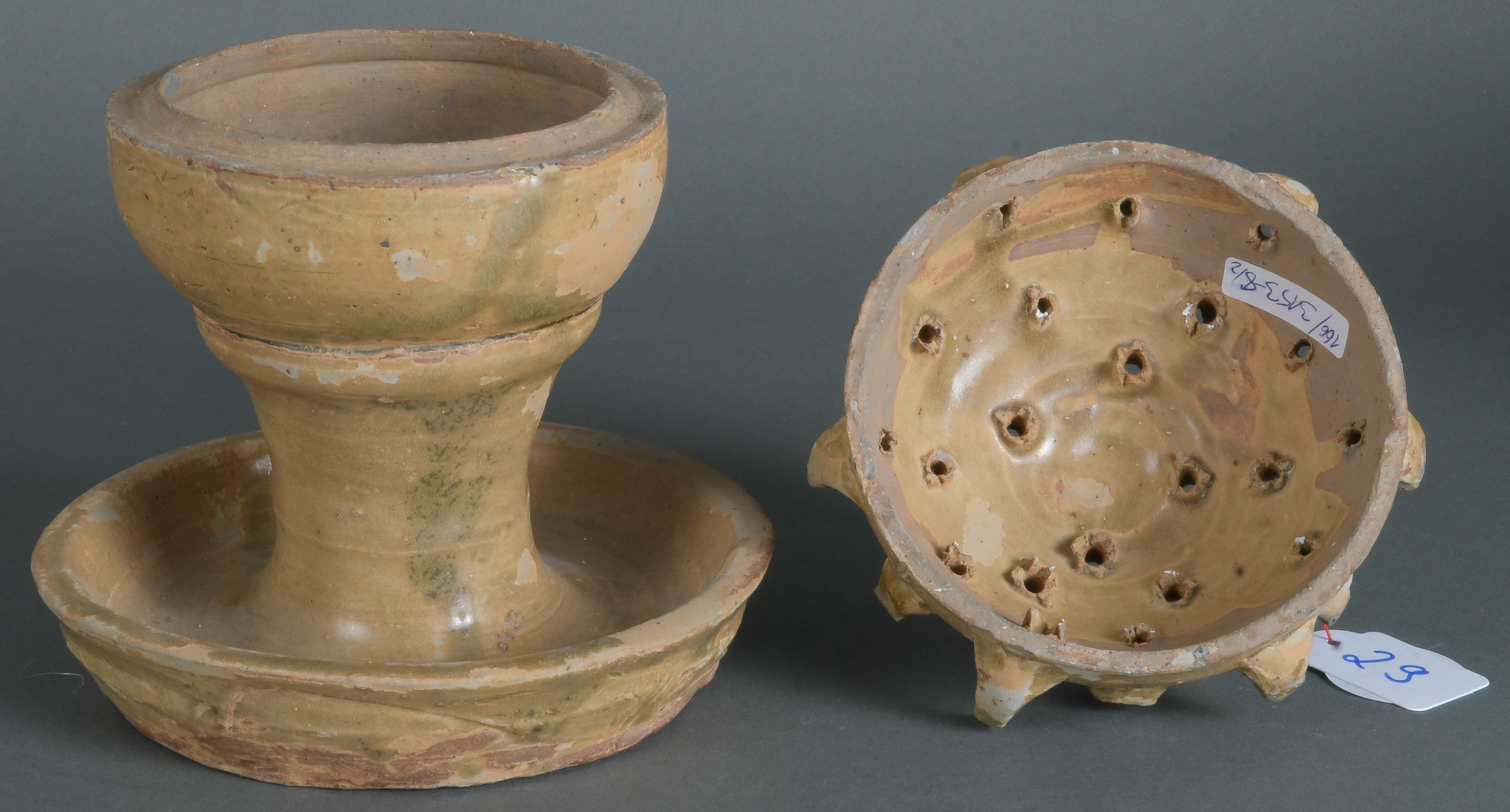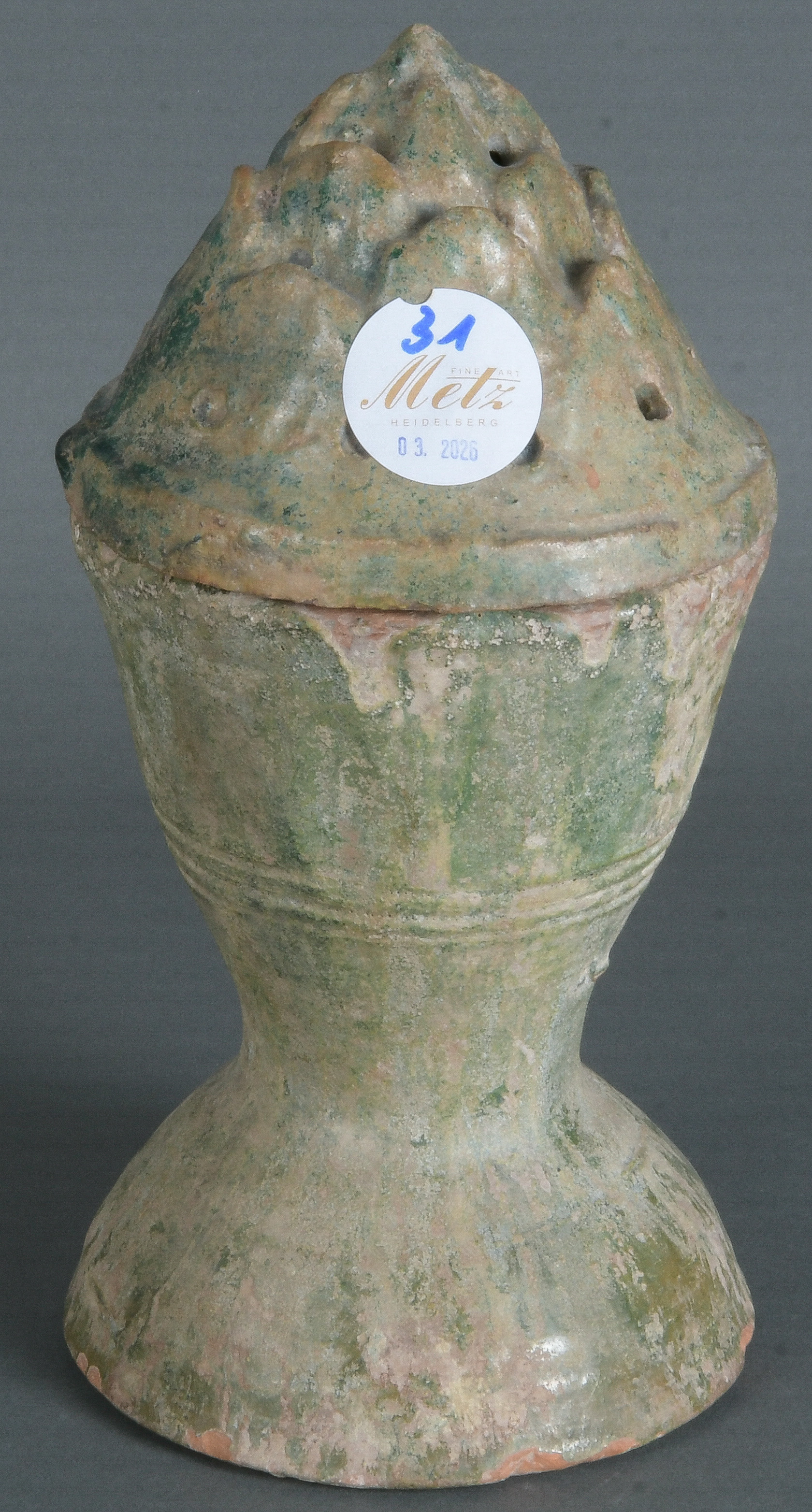 - Katalog-Nr: 31Weihrauchgefäß. China, Han-Dynastie 206 v. Chr. - 220 n. Chr. Keramik / Terrakotta, mit grüner transparenter Glasur: Sog. Boshan-Typ, der durchbrochene Deckel bildet eine stilisierte Berglandschaft nach, das Unterteil in Form eines Fußbechers, H=22,5 cm. Provenienz: Galerie Eskenazi, London 1997; Sammlung Prof. Dr. Peer Hultberg (1935-2007), Hamburg.o.L.
