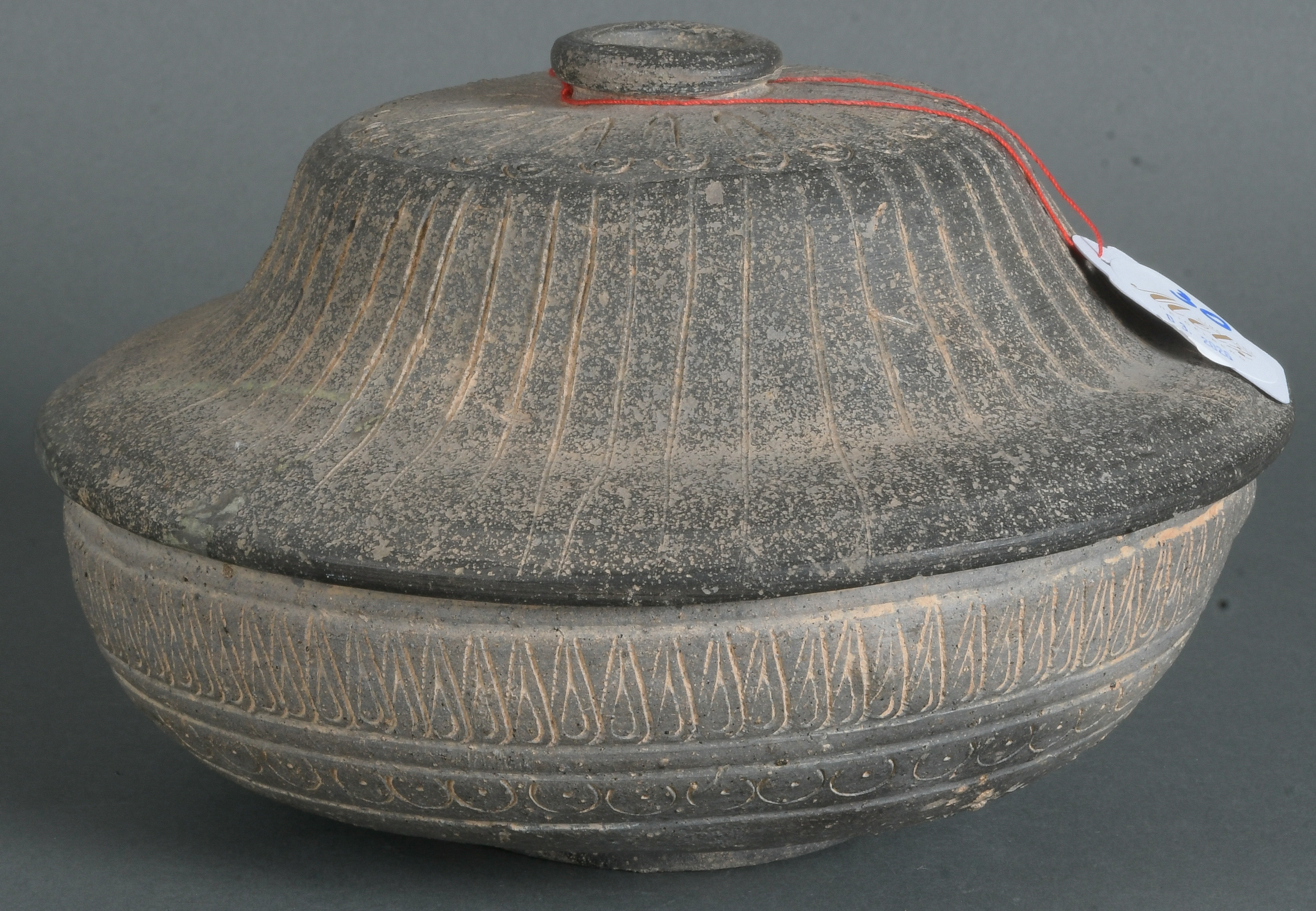 - Katalog-Nr: 30Deckeldose. Korea, Silla-Reich 57 v. Chr. - 668 n. Chr. Steinzeug, schwarz gebrannt, mit eingeritzten und gestempelten Ornamenten dekoriert. Flach gemuldete Schale auf Strandring, Deckel in Form eines Daches mit Ringknauf. Beide Teile mit alter Sammlungsnummer, Schalenunterseite mit Sedimentanhaftungen, H=12,5 cm, D=18 cm (Deckel rest.). Provenienz: Sammlung Prof. Dr. Peer Hultberg (1935-2007), Hamburg. Vgl.: W.B. Honey „Corean Pottery“, London o.J., Taf. 2.o.L.