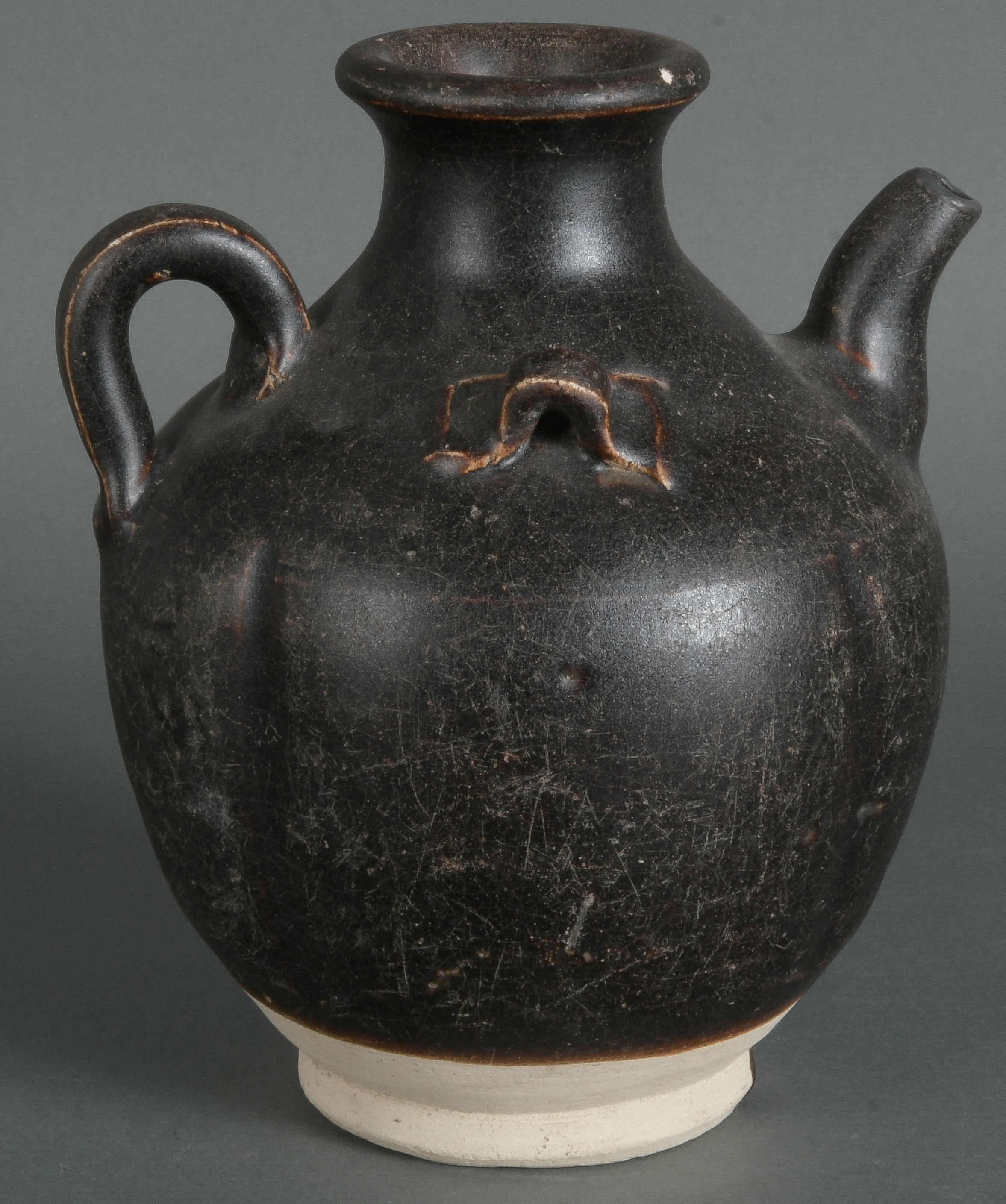 - Katalog-Nr: 33Kleine Kanne. China Fünf Dynastien / Song-Dynastie. Sehr heller Steinzeugscherben, mit dunkelbrauner, stark deckender Glasur. Bauchige Form, kurzes geschwungenes Ausgussrohr, zwei anmodellierte Schlaufen auf der Gefäßschulter, anmodellierter Henkel, H=16 cm. Provenienz: Sammlung Prof. Dr. Peer Hultberg (1935-2007), Hamburg. (am Ausgussrand min. retuschiert, min. gechippt am Rand)o.L.