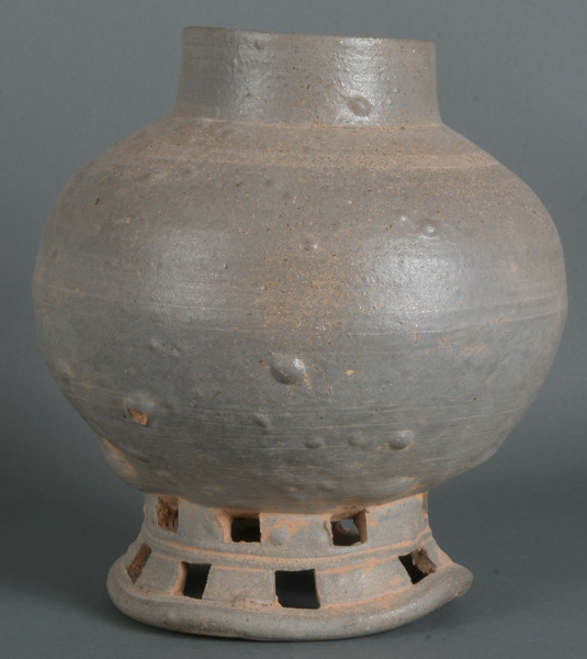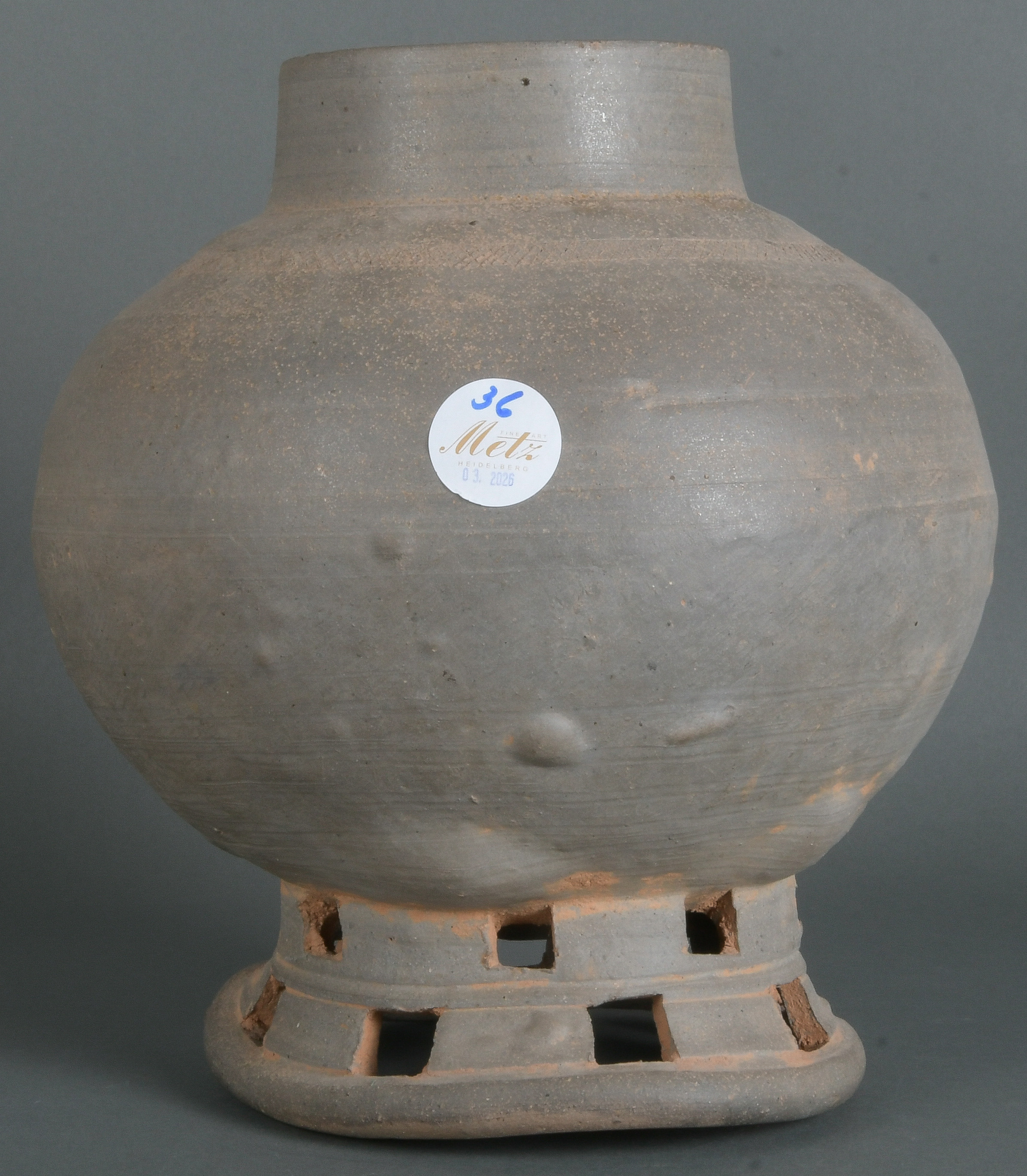 - Katalog-Nr: 36Vorratsgefäß. Korea, Silla-Reich 5./6. Jh. Steinzeug, mit grauer Glasur und schmalem Band mit Netzgravur auf der Schulter. Bauchig mit kurzem zylindrischem Hals, auf zweireihig quadratisch ausgeschnittenem konkav geschwungenem Fuß, H=26 cm. Provenienz: Sammlung Prof. Dr. Peer Hultberg (1935-2007), Hamburg.o.L.