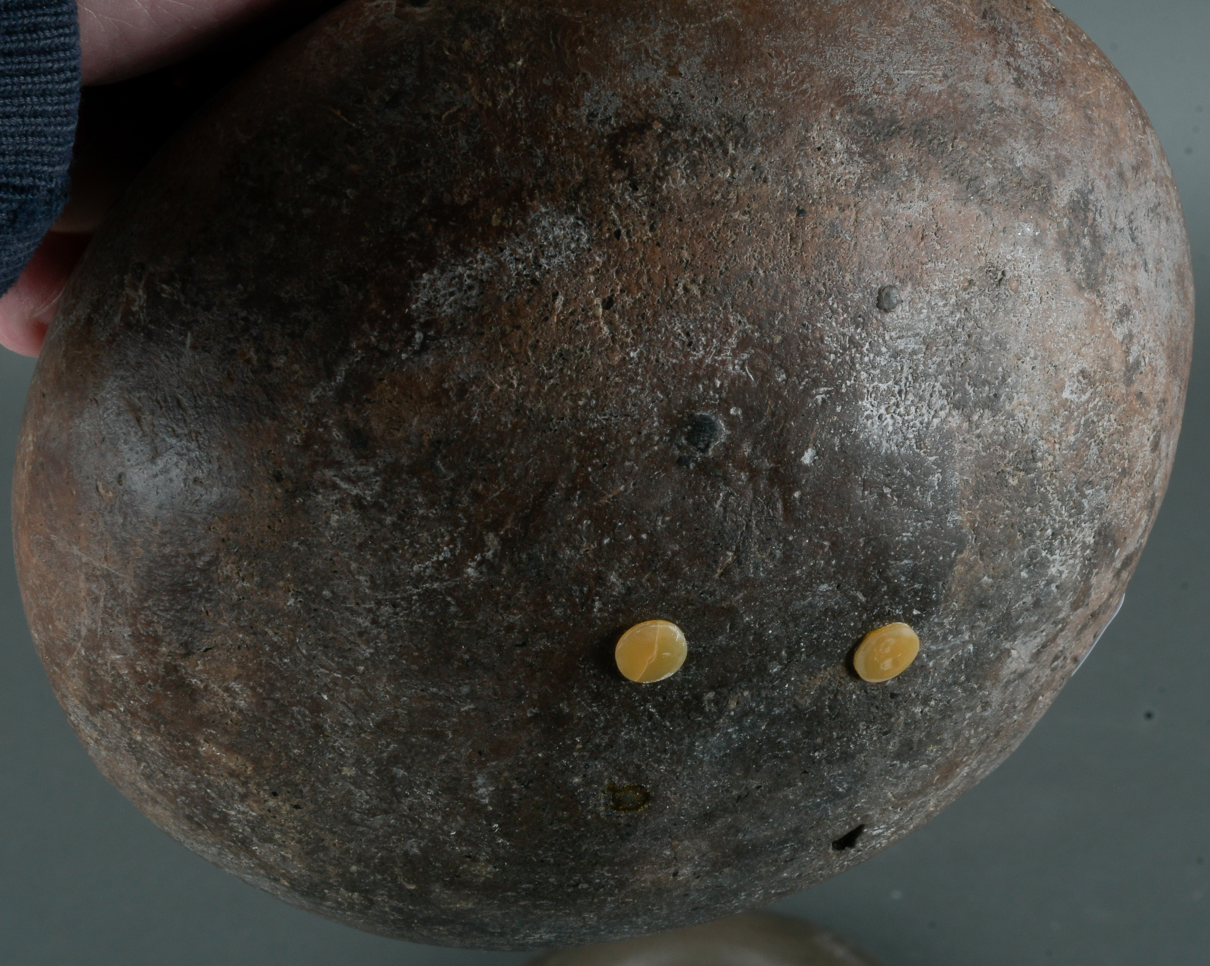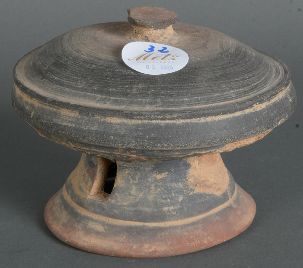 - Katalog-Nr: 32Deckelschale. Korea, Silla-Reich 57 v. Chr. - 668 n. Chr. Steinzeug, rötlicher Scherben, partiell schwarz gebrannt. Flach gemuldelte Schale mit nicht passgenauem Deckel, auf konkavem Standfuß, H=10 cm, D=13,5 cm. Provenienz: Sammlung Prof. Dr. Peer Hultberg (1935-2007), Hamburg. (Deckel ergänzt, am Knauf und Rand best., Sedimentanhaftungen)o.L.