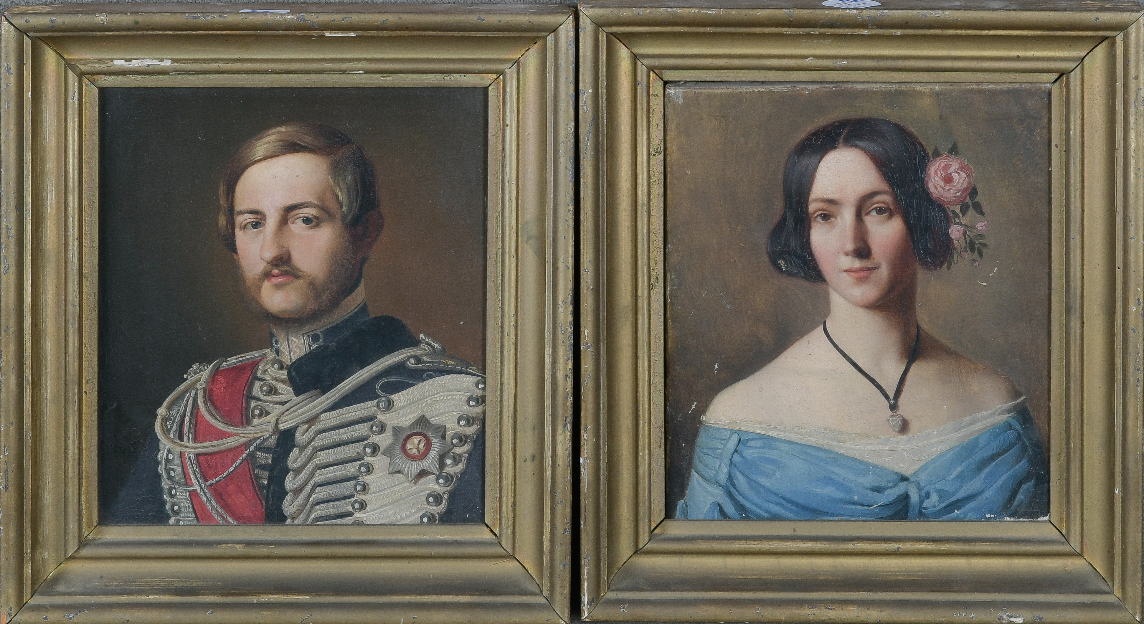 - Katalog-Nr: 45Theodor Ferdinand Hildebrandt (1804-1874). Porträt von Eugen Wilhelm Alexander Erdmann Herzog von Württemberg (1820-1875) und Mathilde zu Schaumburg-Lippe Herzogin von Württemberg (1818-1891). Öl/Lw., eines li./u./monogr./dat. (18)46, gerahmt, je 24 x 21 cm.o.L.