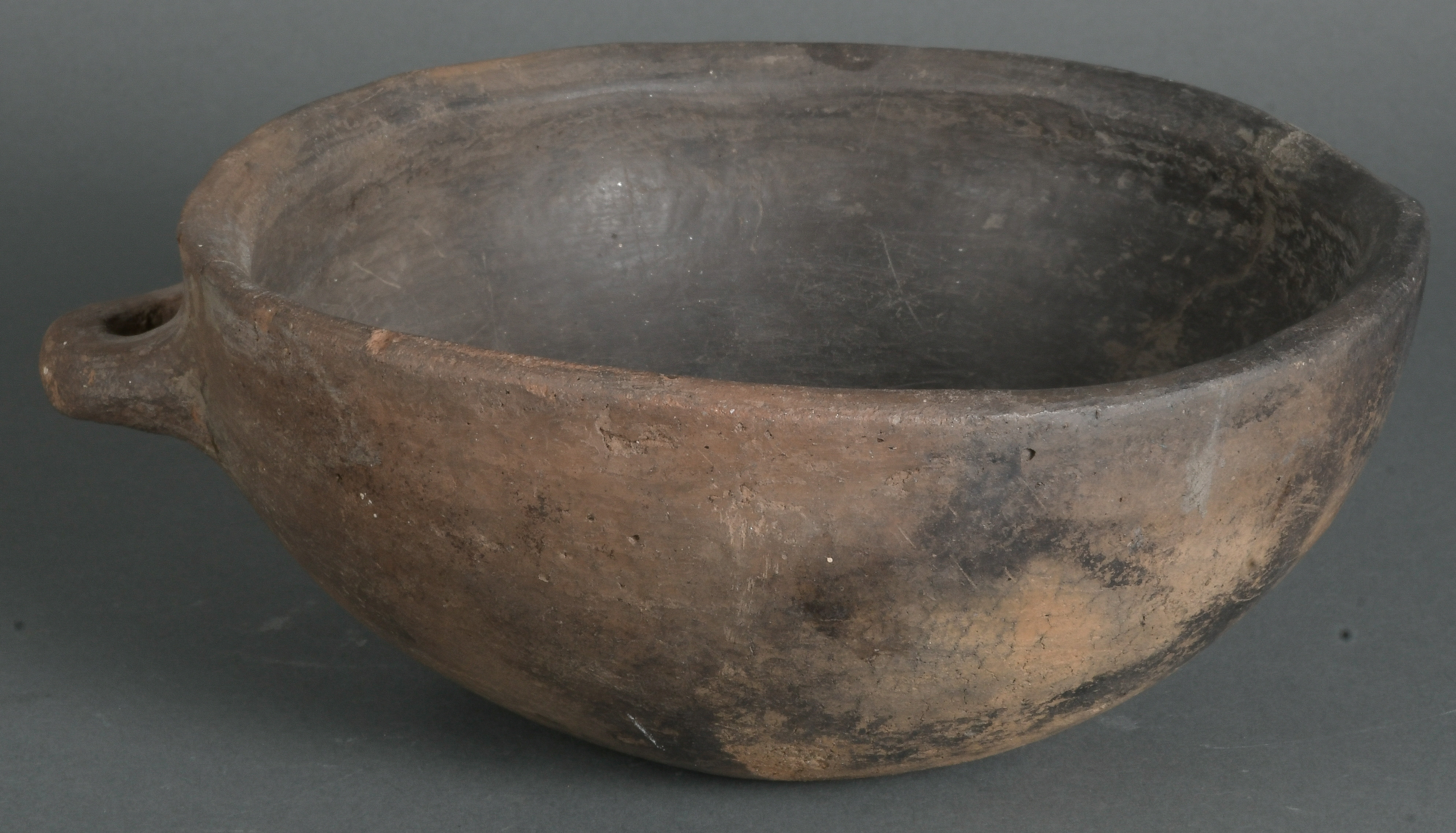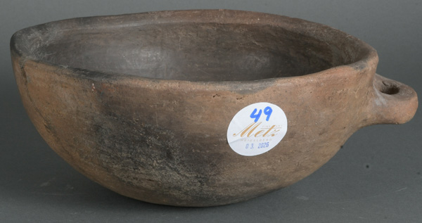 - Katalog-Nr: 49Schale. Wohl Ostasien Altertum. Keramik, unglasiert, partiell durch Brand schwarz verfärbt. Rund gemuldet, mit abgeflachter Standfläche und einem anmodelliertem Griff, D=19 cm. Provenienz: Sammlung Prof. Dr. Peer Hultberg (1935-2007), Hamburg. (durchgehender Riss rest., am Boden alte Sammlungs- oder Fund-Nr. „52“)o.L.