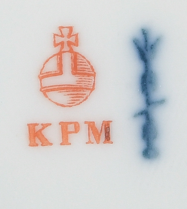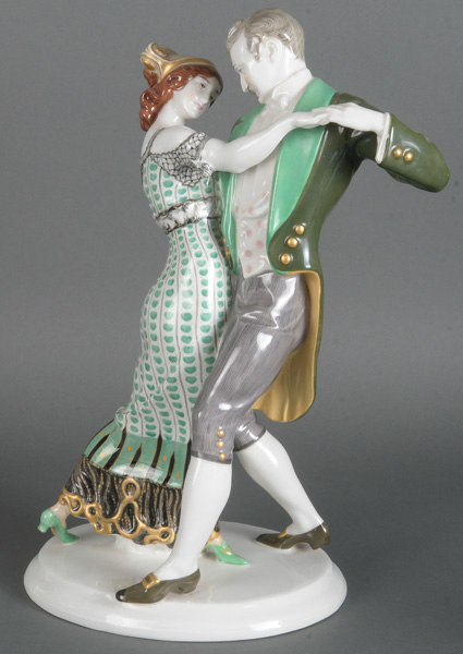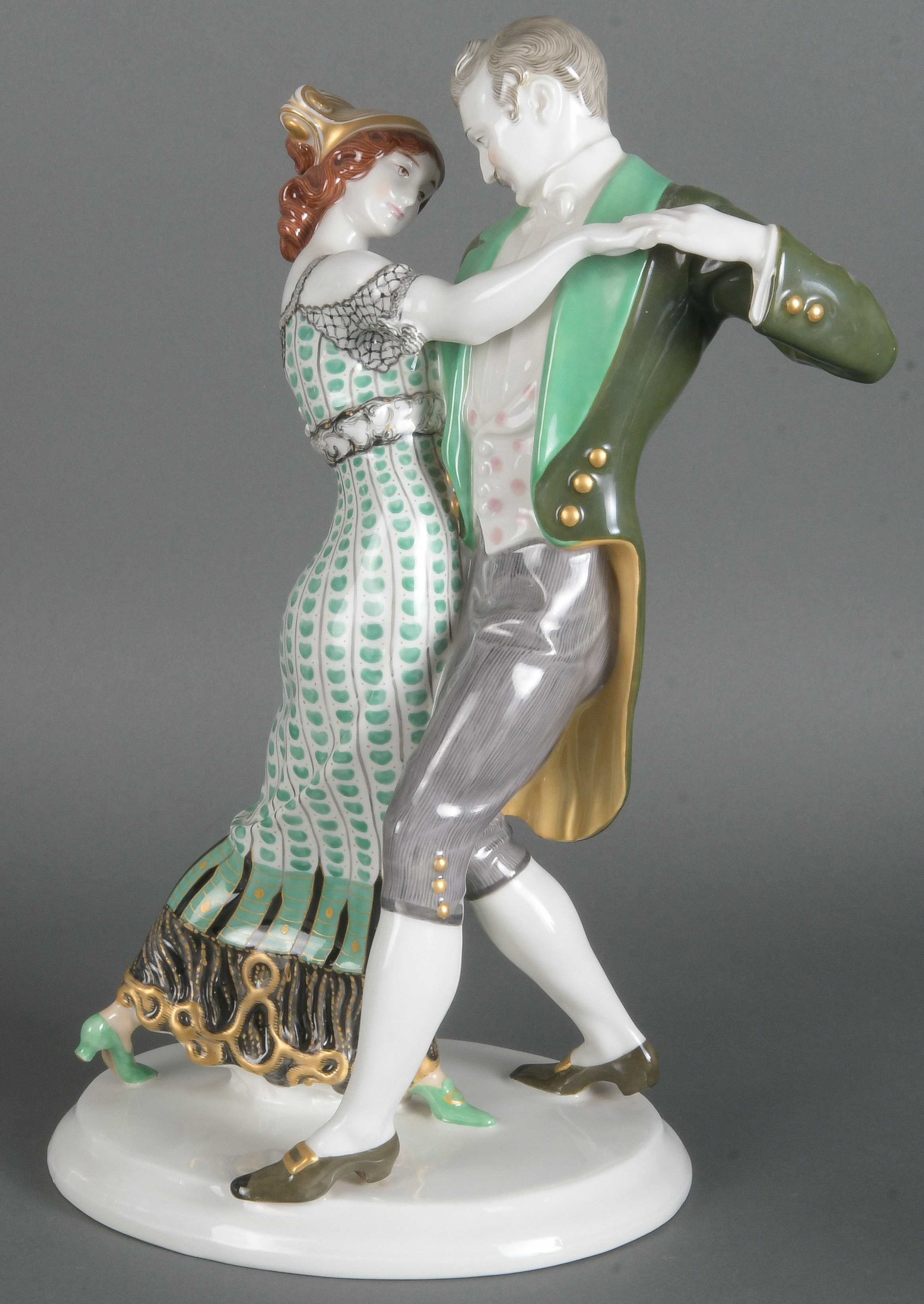 - Katalog-Nr: 50Tänzerpaar. Berlin 1915. Je stehend auf ovalem, profiliertem Sockel. Porzellan, bunt bemalt, am Boden unterglasurblaue Szeptermarke mit korallenrotem „KPM“ und Reichsapfel, Formnummer „10375“ mit Jahresbuchstabe, Staffiererziffer „140/816.f“, Entwurf und sign. Ferd.(inand) Liebermann, H=32 cm.o.L.