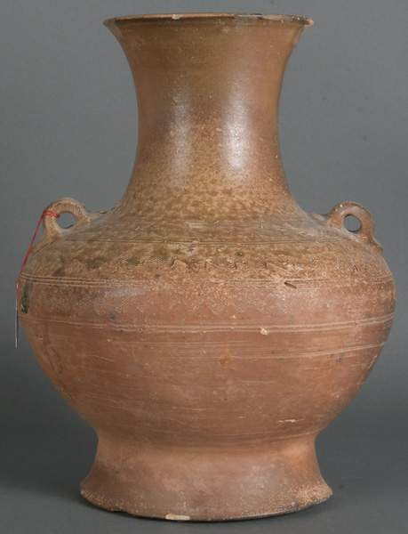 - Katalog-Nr: 35Vorratsgefäß für Wein. China, Han-Dynastie 206 v. Chr. - 220 n. Chr. Steinzeug, mit eingraviertem Dekor aus horizontalen Rillen und dazwischen liegenden Wellenbändern. Transparente leicht grüne Glasur (Ascheglasur) auf der Gefäßschulter, stellenweise bis zum Fuß verlaufend. Balusterförmig mit zwei anmodellierten Henkeln und konkavem Hals, H=28,5 cm. Provenienz: Sammlung Prof. Dr. Peer Hultberg (1935-2007), Hamburg. (Rand min. rest.)o.L.