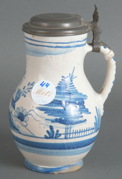 - Katalog-Nr: 44Birnkrug. Hanau 18. Jh. Fayence, unterglasurblau bemalt mit Architekturen, mit Zinnmontur und -deckel, ohne Marke, H=17,5 / 20 cm. (min. best.)o.L.