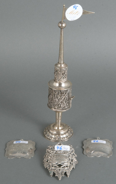 - Katalog-Nr: 46Viertlgs. Konvolut Judaica. Wohl deutsch 20. Jh. Silber, ca. 168 g, bestehend aus: Besamim-Turm (H=25,5 cm) und drei unterschiedlich beschriftete Schilder (5 x 5,5 / 7,5 x 6 cm)o.L.