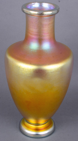 - Katalog-Nr: 48Hohe Jugendstil-Vase. New York, Louis Comfort Tiffany um 1900. Farbloses Glas, lachsfarben lüstrierend überfangen; am Boden Ätzsignatur und Nr. „36042“, H=39 cm.o.L.