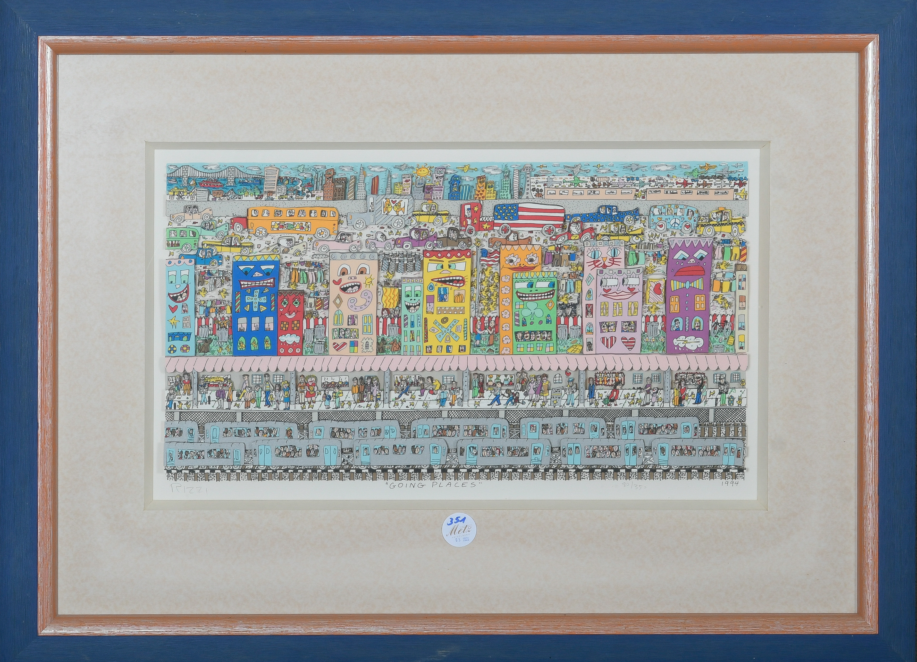 - Katalog-Nr: 351James Rizzi (1950-2011). „Going Places“. Farblithographie mit 3D, Aufl. 80/350, li./u./sign./dat. 1994, mit Passepartout hi./Gl. gerahmt, 28 x 51 cm.o.L.