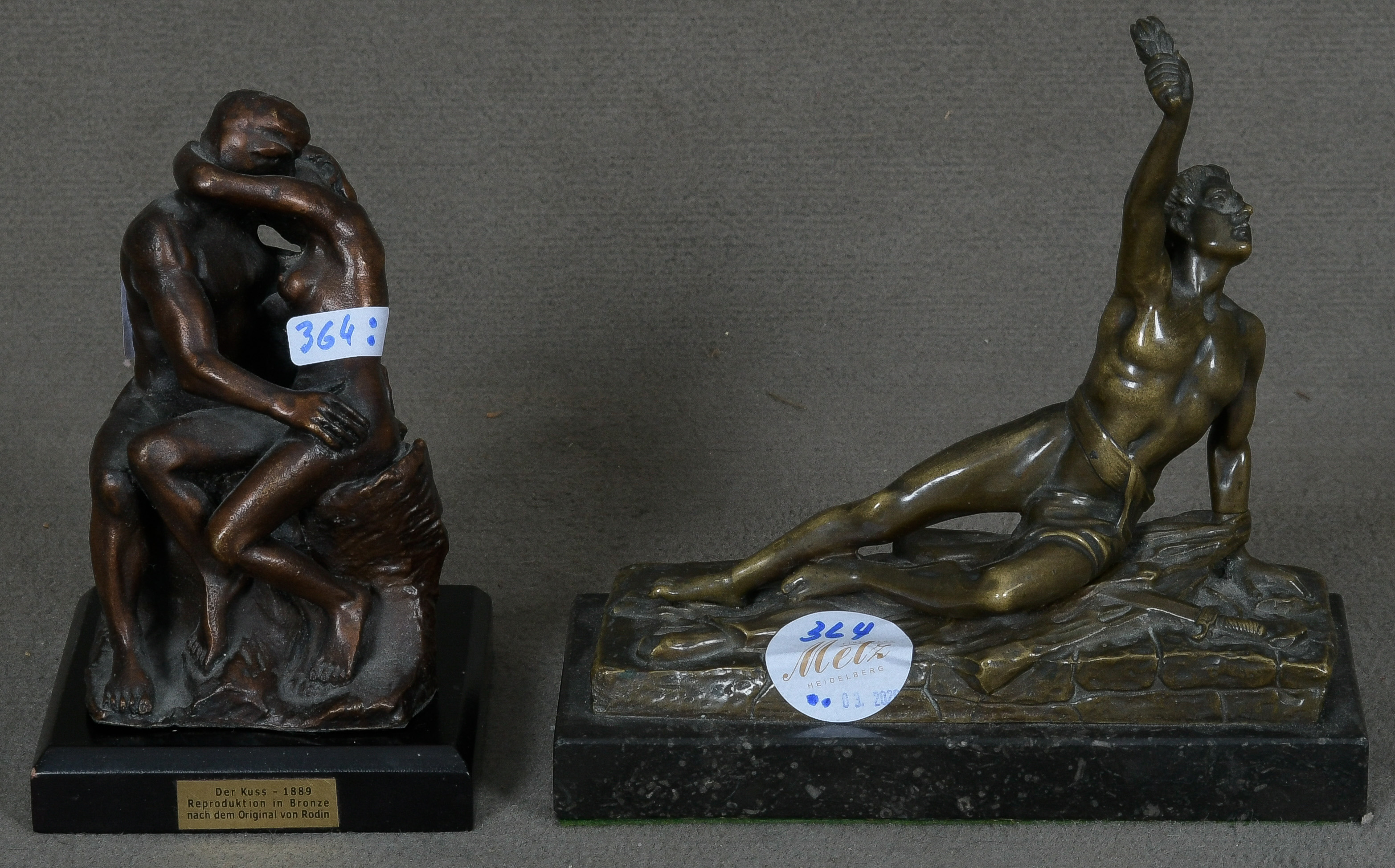 - Katalog-Nr: 364Bildgießer des 20. Jhs. Staffelläufer. Bronze, auf Marmorsockel (H=16 cm); dazu „Der Kuss“ nach Auguste Rodin. Gips, H=14 cm.o.L.