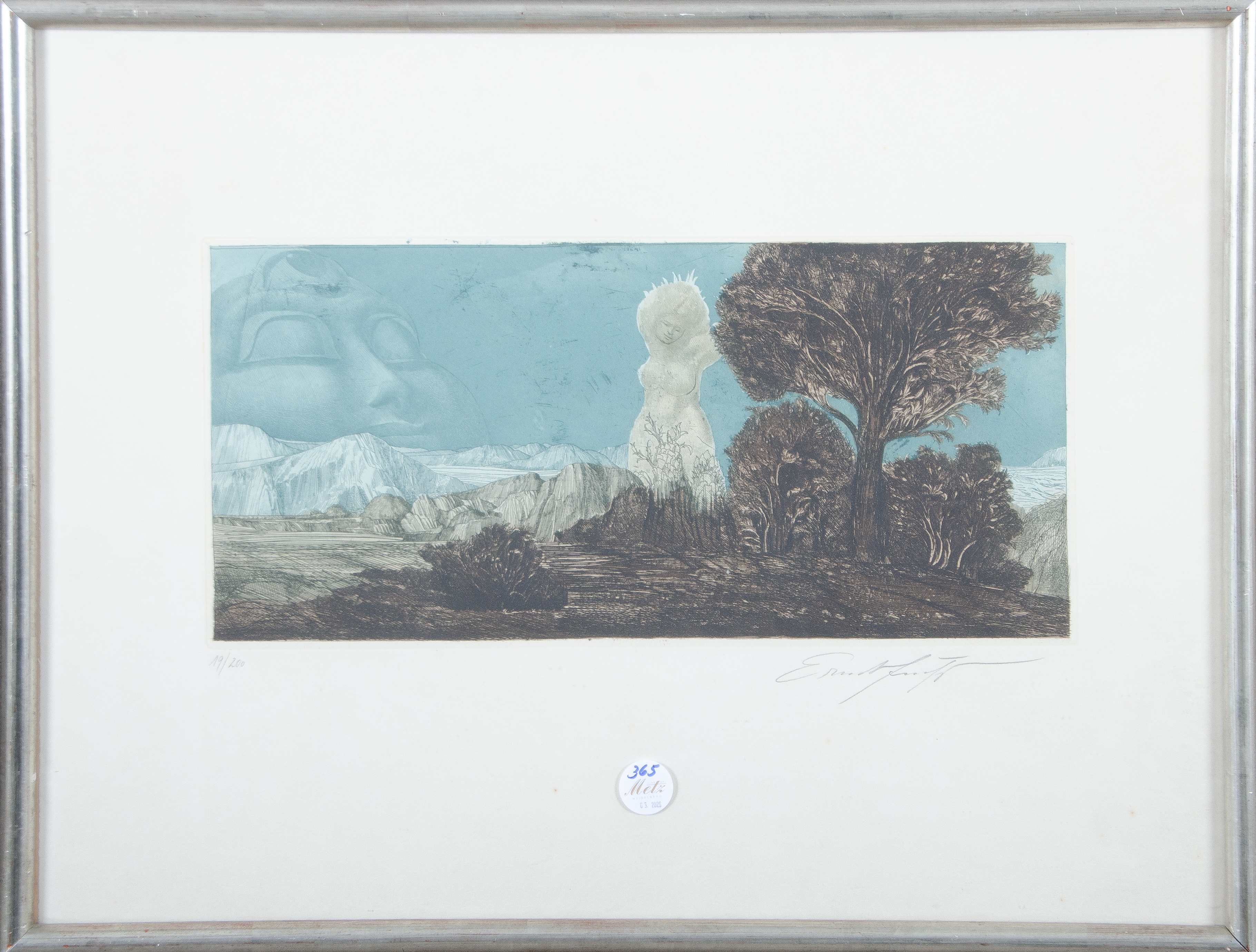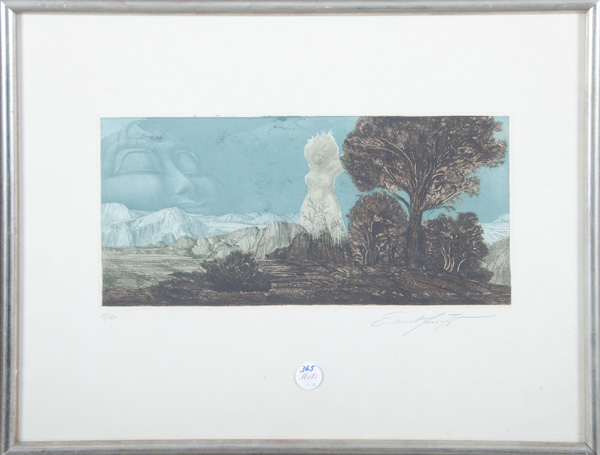 - Katalog-Nr: 365Ernst Fuchs (1930-2015). „2 Bll. Zyklopische Landschaft. Hain der Daphne“ (1967). Aquatintaradierung 19/200, re./u./sign., hi./Gl. gerahmt, 21 x 47 cm.o.L.