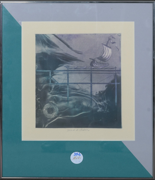 - Katalog-Nr: 352Graphiker des 20. Jhs. Segelboot bei stürmischer See. Farblithographie 3/20, mittig/u. unleserlich sign., mit Passepartout hi./Gl. gerahmt, 23,5 x 20,5 cm.o.L.