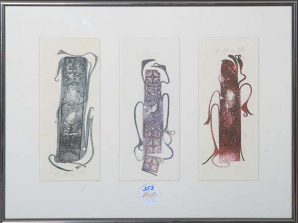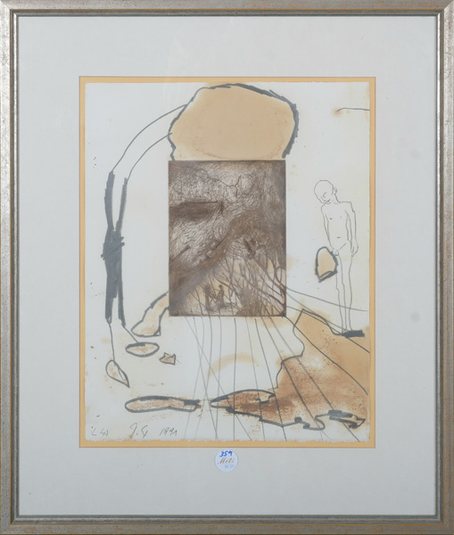 - Katalog-Nr: 353Graphiker des 20. Jhs. Surrealistische Komposition. Farblithographie EA, re./u. bzw. re./o. unleserlich sign./dat. 1992, mit Passepartout hi./Gl. gerahmt, 16 x 5,5 cm.o.L.