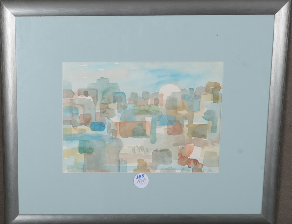 - Katalog-Nr: 355Erika Bouchareb (Malerin des 20. Jhs.). Stadtansicht. Aquarell/Papier, re./u./sign., mit Passepartout hi./Gl. gerahmt, 21,5 x 31 cm.o.L.