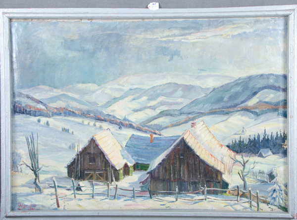 - Katalog-Nr: 367C. Menge (Maler des 20. Jhs.). Winterlandschaft mit Hütten. Öl/Lw., li./u./sign., gerahmt, 70 x 99 cm. (besch.)o.L.
