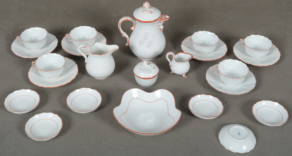 - Katalog-Nr: 37217-tlgs. Mokkaservice. Meissen 20. Jh. Porzellan, mit korallenrot staffiertem Lippenrand; am Boden unterglasurblaue Schwertermarke mit Schleifstrich. Bestehend aus: Eine Mokkakanne (H=16 cm), zwei Milchgießer (H=7 / 9,5 cm), eine Zuckerdose (H=6 cm, D=5,8 cm), sechs Mokkatassen mit Unterschalen, sechs kleine Schälchen (D=je 8 cm) und eine Schale (D=15 cm).o.L.