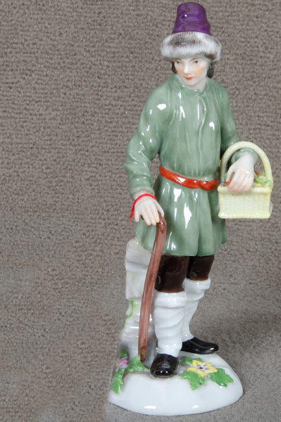 - Katalog-Nr: 373Obstverkäufer aus der Serie „Cris de St. Petersburg“. Meissen dat. 1910. Porzellan, bunt bemalt; am Boden unterglasurblaue Schwertermarke. Modell nach Peter Reinicke, H=15,3 cm.o.L.