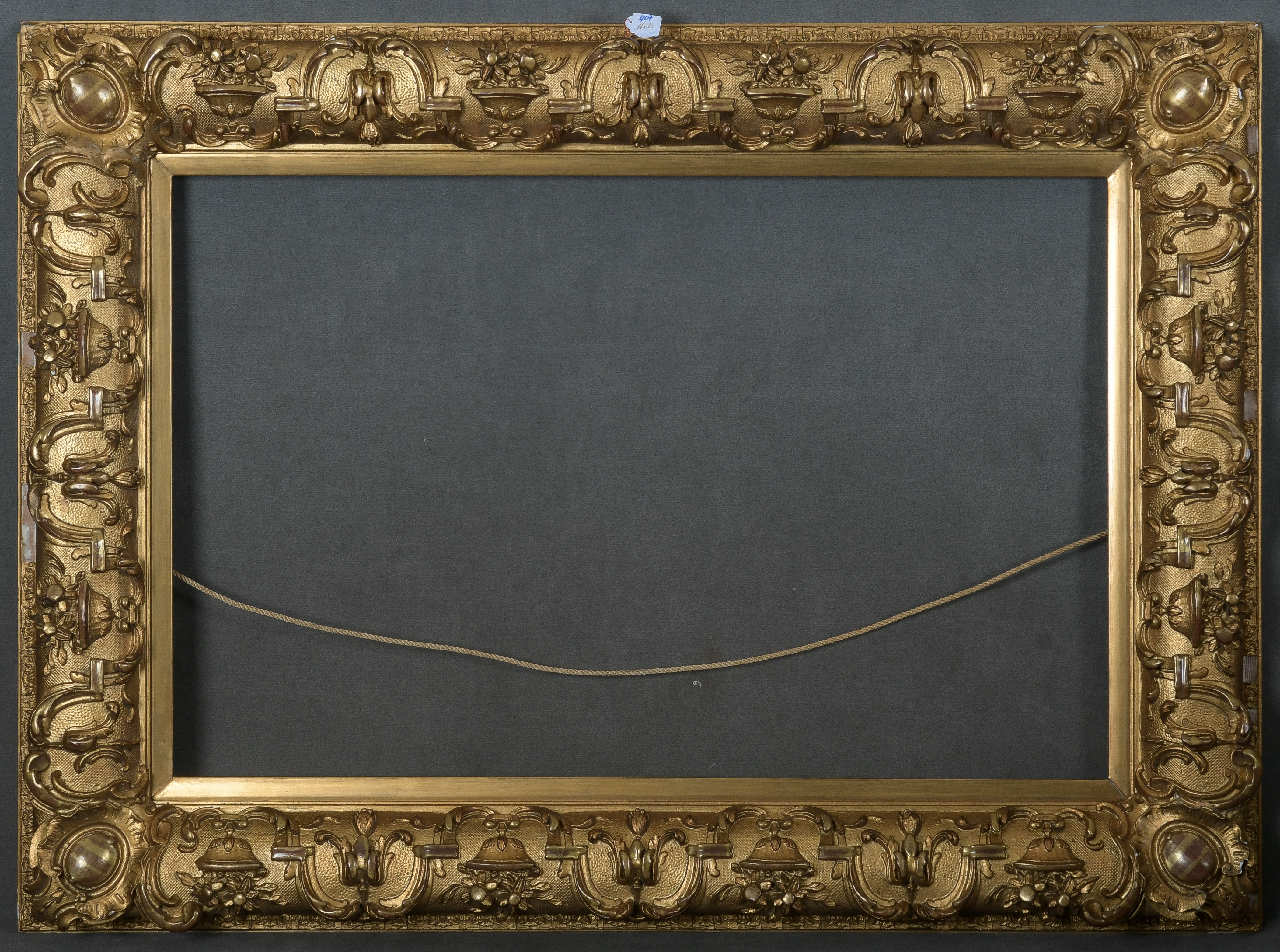 - Katalog-Nr: 407Großer Rahmen. Deutsch um 1900. Massivholz / Stuck, auf Kreidegrund vergoldet; profiliert mit Blumen-, Muschel- und Rocailledekor, 69,5 x 106,5 cm. (besch.)o.L.