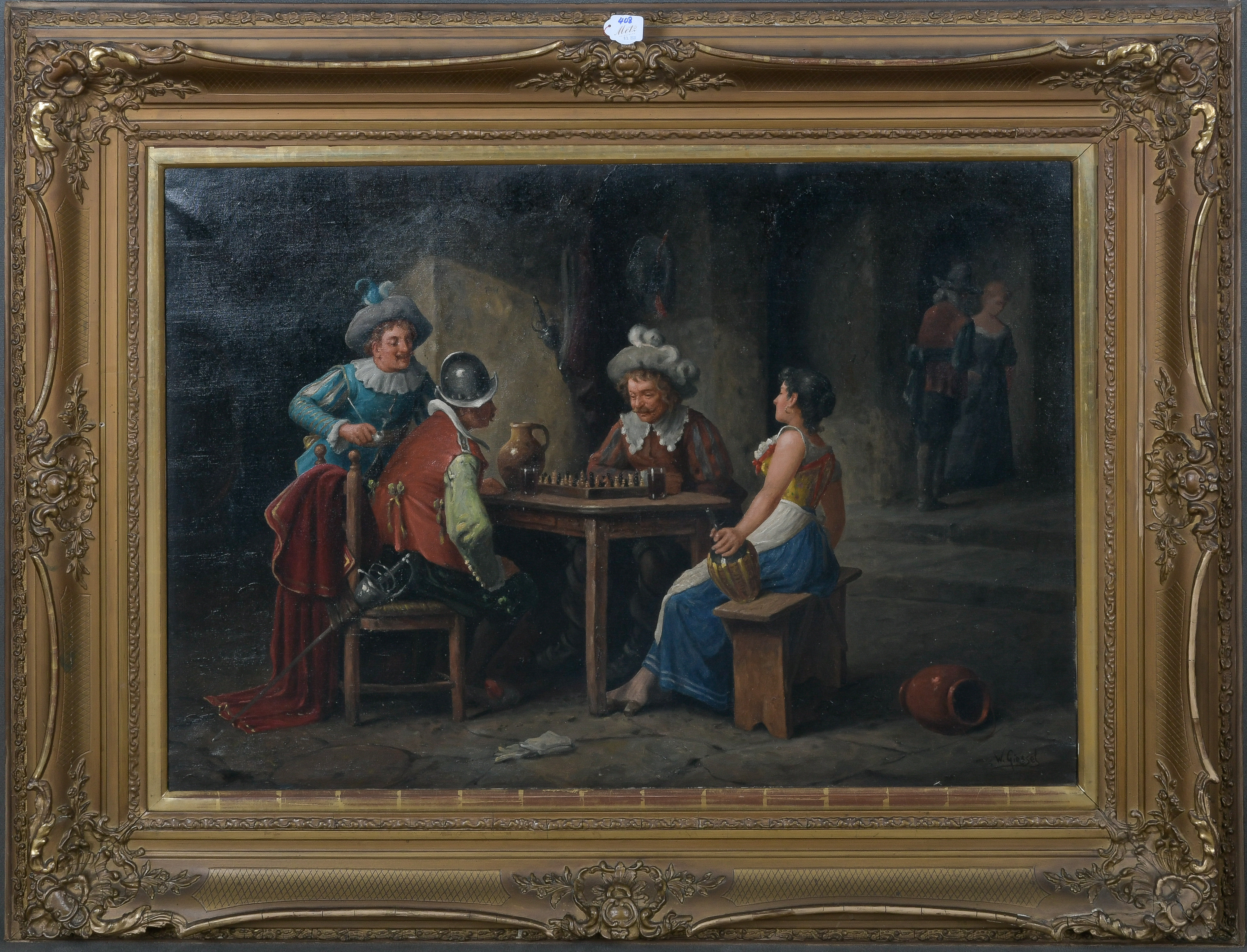 - Katalog-Nr: 408Wilhelm Friedrich Giessel (1869-1938). Wirtshausszene. Öl/Lw., re./u./sign., gerahmt, 66 x 93 cm.o.L.