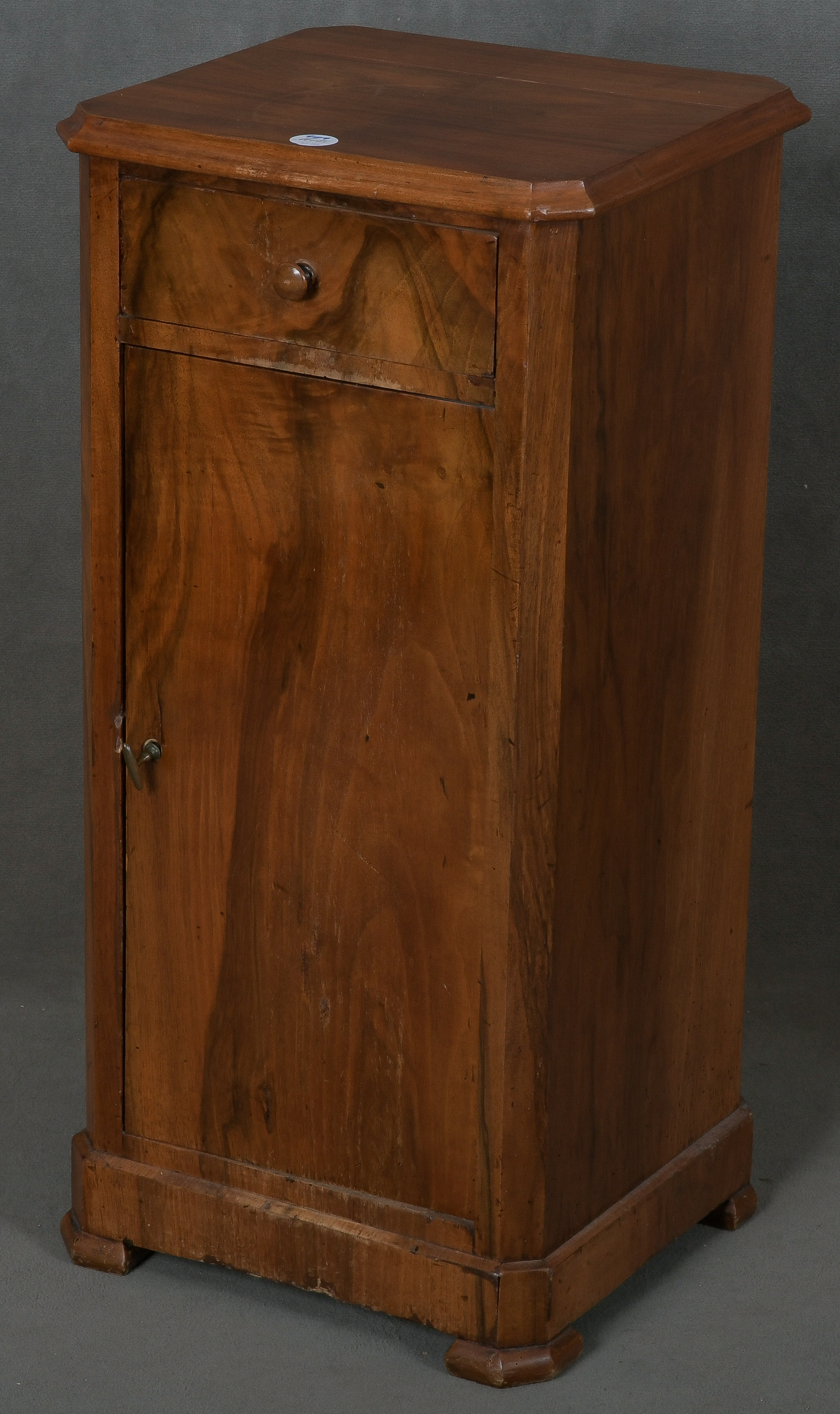 - Katalog-Nr: 409Spätbiedermeier-Nachttisch. Deutsch 19. Jh. Nussbaum furniert, teilw. massiv; abgerundete Klotzfüße, eintürige Front, darüber Schub, abgeschrägte Kanten, überstehende Platte, H=81 cm, B=39 cm, T=36 cm.o.L.