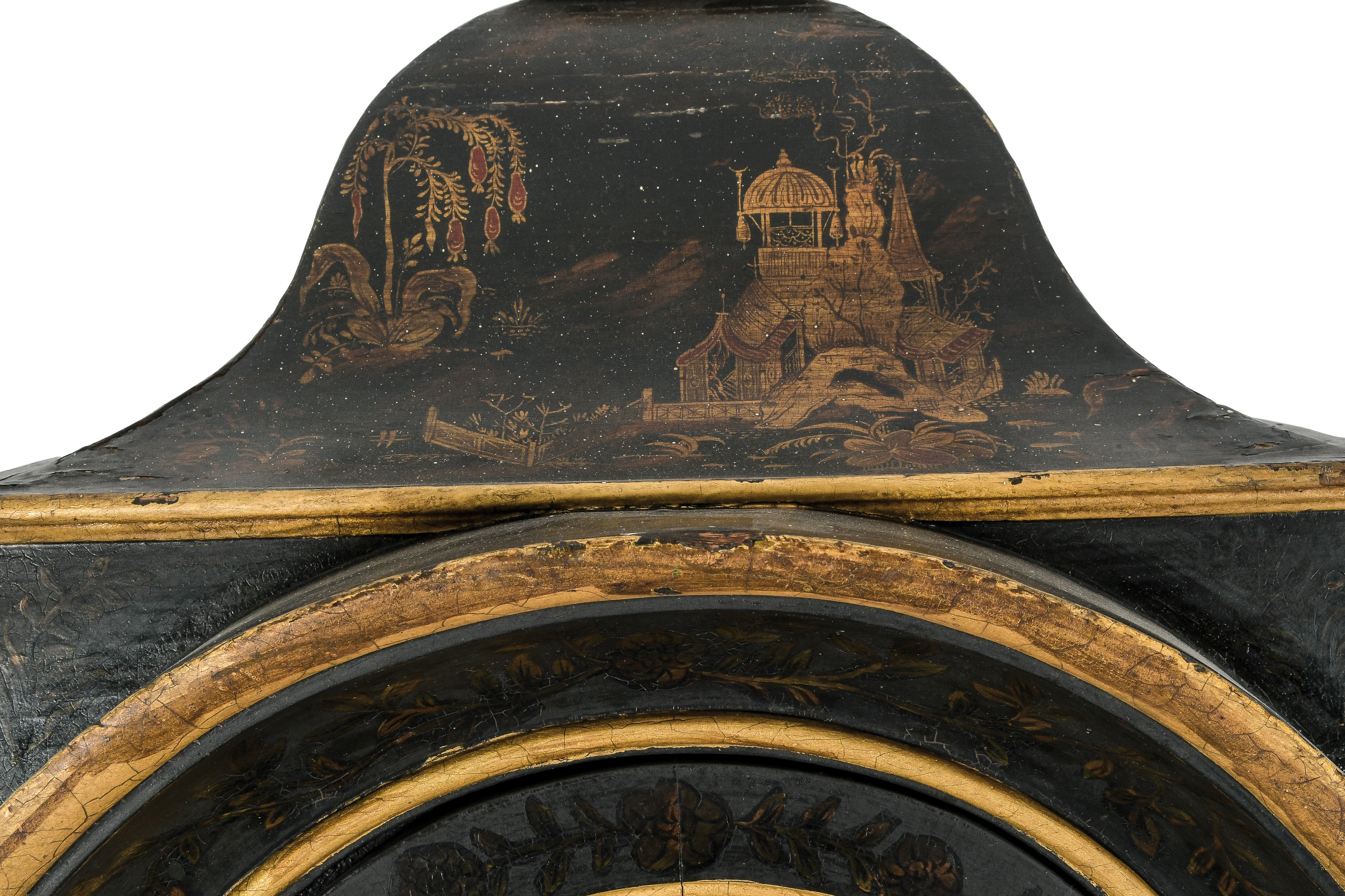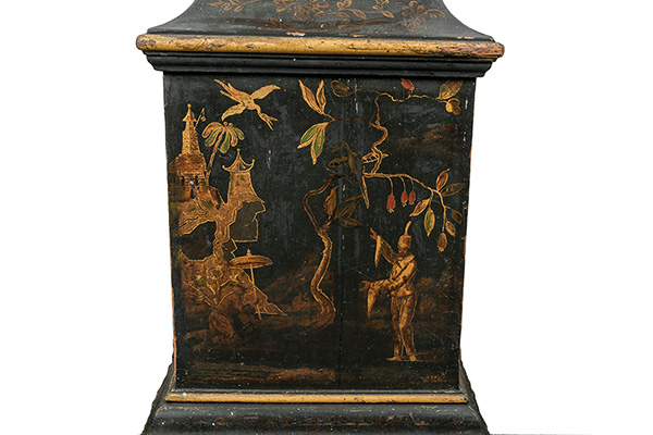 - Katalog-Nr: 416Hochbedeutende, chinoise gelackte, höfische Standuhr. Mannheim, Hofuhrmacher Anthonius Schmitz um 1730-40. Überaus fein gelacktes und teilvergoldetes Holzgehäuse mit profiliertem und erhöhtem Sockel, eingezogener Schulter und elegant aufsteigendem Pendelkasten mit rund ausgeschnittenem Pendelgucker (H=265 cm, B=50 cm, T=30 cm). Das Werkgehäuse dreiseitig verglast und pagodenartig abschliessend. Geschweiftes und bogenartiges Kranzgesims. Das Zifferblatt mit versilbertem Zifferring für römische Stundenzahlen und arabischen Minutenangaben. Das innere Zifferfeld fein vergoldet. Die Stahlzeiger patiniert und versilbert, durchbrochen mit Herzmotiven. Zwischen den römischen Stundenzahlen feine Fleur de Lys-Motive. Weibliche Mascarons in schönster Régence-Manier, umgeben von feinem Rollwerk von Ranken und Blüten, alles in vergoldetem Metall, betonen die Ecken. Über dem Zifferblatt auf versilbertem Medaillon die von Ehrenlaub umrahmte Signatur des Hofuhrmachermeisters Anton Schmitz, in geschwärzten Lettern ANTHONIUS SCHMITZ MANHEIM, flankiert von rankenumwundenen Delphinen. Alles auf rotem Grund montiert. Das Werk mit Schlagwerk auf acht massiven Tonfedern wurde im 19. Jh. ergänzt. Das prächtige Gehäuse mit feinster, polychromer Chinoiseriemalerei auf schwarzem Grund. Fantasievolle Parklandschaften, ausgestattet mit höfischen Figuren, Parasolträgern und paradiesischen Vögeln, Schlossanlagen auf felsigen Hügeln, Pagoden in allen Formen, zieren die prächtige Front. Die Schmalseiten mit Rankenwerk und fantasievollen Gewächsen. Das Innere in roter Fassung. Das ganze Gehäuse in völlig unberührtem Originalzustand; das Uhrwerk im 19. Jh. ergänzt. Provenienz: Möglicherweise für Kurfürst Karl III. Philipp von der Pfalz für dieKurpfälzer Residenzschlösser Schwetzingen oder Mannheim gefertigt; alter Basler Patrizierbesitz. Die hier angebotene, höfische Standuhr mit feinster Lackmalerei, aus der Zeit um 1730-40, ist ein bedeutendes Werk des Mannheimer Hofuhrmachers Antonius Schmitz und eines noch unbekannten, wohl kurpfälzischen Lackmalers und gehört mit seinem völlig unverfälschten Gehäuse zu den schönsten Schöpfungen der süddeutschen Lackkunst der ersten Hälfte des 18. Jhs. Eine elegante Tischuhr des Meisters Schmitz mit völlig identisch graviertem, versilbertem Zifferring, wiederum mit den leicht stilisierten Lilien, den Fleurs de Lys, zwischen den römischen Ziffern und identischen Eckzierden mit Mascarons in vergoldeter Bronze, wie auch den von Ranken umrahmten Delphinen, fand sich in den Sammlungen der Großherzöge und Markgrafen von Baden und wurde durch Sotheby’s im Oktober 1995 als Los 94 versteigert (Zuschlag DM 50.400,00). Die Markgrafen-Uhr mit ihrem ebonisierten Gehäuse dürfte wohl für den Kurfürsten Karl III. Philipp von der Pfalz (4. Nov. 1661 in Neuburg an der Donau – 31. Dez. 1742 in Mannheim) entstanden sein und es ist mit größter Wahrscheinlichkeit davon auszugehen, dass auch unsere Standuhr mit ihrer stattlichen Höhe und ihrem höfischen, chinoisen Dekor für den Kurfürsten geschaffen wurde. Vielleicht für dessen Residenzschloss in Schwetzingen oder auch für das seit 1720 in Bau befindliche Mannheimer Schloss, wohin die kurpfälzische Residenz in Heidelberg 1720 übersiedelte. Karl III. Philipp nahm von 1691 bis 1694 an den Türkenkriegen teil und wurde in den Rang eines Generalfeldmarschalls erhoben und in der Folge 1694 als Ritter in den Orden vom Goldenen Vlies aufgenommen. Der kunstbegeisterte Regent verlegte seine Residenz von Heidelberg nach Mannheim, wo nach Entwürfen des Architekten Jean Clemens Froimon, im Jahre 1720 mit den umfangreichen Bauarbeiten begonnen wurde. Durch Froimon entstand 1725 auch die erste Gesamtansicht der grandiosen Schlossanlage. 1726 wurde Froimon durch den berühmten Guillaume d’Hauberat als Hofbaumeister abgelöst. In dieser Zeit wurden die prächtigen Deckengemälde des Schlosses durch Cosmas Damian Asam (1728-1730) geschaffen. Mit Alessandro Galli da Bibiena begann 1740 die zweite Bauphase des Mannheimer Schlosses, welches nach dem Tode des Kurfürsten 1742 durch dessen Nachfolger, Karl Theodor, in den Jahren um 1760 abgeschlossen werden konnte. Architekt dieser letzten Bauphase war ab 1750 der in Lunéville geborene Architekt Nicolas de Pigage, zu dessen Hauptwerken der Schwetzinger Schlossgarten, die Mannheimer Hofbibliothek und das Schloss Benrath bei Düsseldorf gehörten. Im Mannheimer Schlossinventar von 1755 werden zwei Standuhren mit «laquirten gestell» erwähnt, doch lassen solch sehr vereinfachte Beschreibungen in Inventaren des 18. Jahrhunderts eine genauere Zuweisung nicht zu. Vertieftere Recherchen könnten zur Klärung der ehemaligen Aufstellung dieser kurpfälzischen Schlossuhr beitragen. Ganz sicher war ihr Auftraggeber aber ein Mitglied des Herrscherhauses, davon zeugen nicht nur die stattlichen Ausmasse dieser Bodenstanduhr, sondern auch die von allerhöchster Lackkunst überzogene Schaufläche des Uhrengehäuses selbst, wie wir sie etwa zeitgleich nur in den Werken etwa der Berliner Meister Gérard und Jacques Dagly oder des Andreas Völckert antreffen, wie sie aber in vereinfachter Form auch in Bamberg oder Weikersheim anzutreffen sind. Der bis anhin unbekannte Schöpfer der sehr feinen Lackmalerei unseres Uhrengehäuses orientiert sich sehr genau an ostasiatischen Lackarbeiten, wie wir sie etwa in sehr verwandter Form im Lackkabinett in Schloss Falkenlust in Brühl eingebaut vorfinden, einer Schlossanlage, die durch den Kölner Kurfürsten und Erzbischof Clemens August in Auftrag gegeben wurde, und in den Jahren zwischen 1729 bis 1737 nach Plänen des kurbayerischen Hofbaumeisters François de Cuvilliés entstand und zu den feinsten Schöpfungen des deutschen Rokokos gehört. Es ist zu hoffen, dass die hier angebotene Standuhr wiederum Aufstellung in einem der Schlösser unseres Bundeslandes findet oder aber gleiche Wertschätzng in einer Privatsammlung 