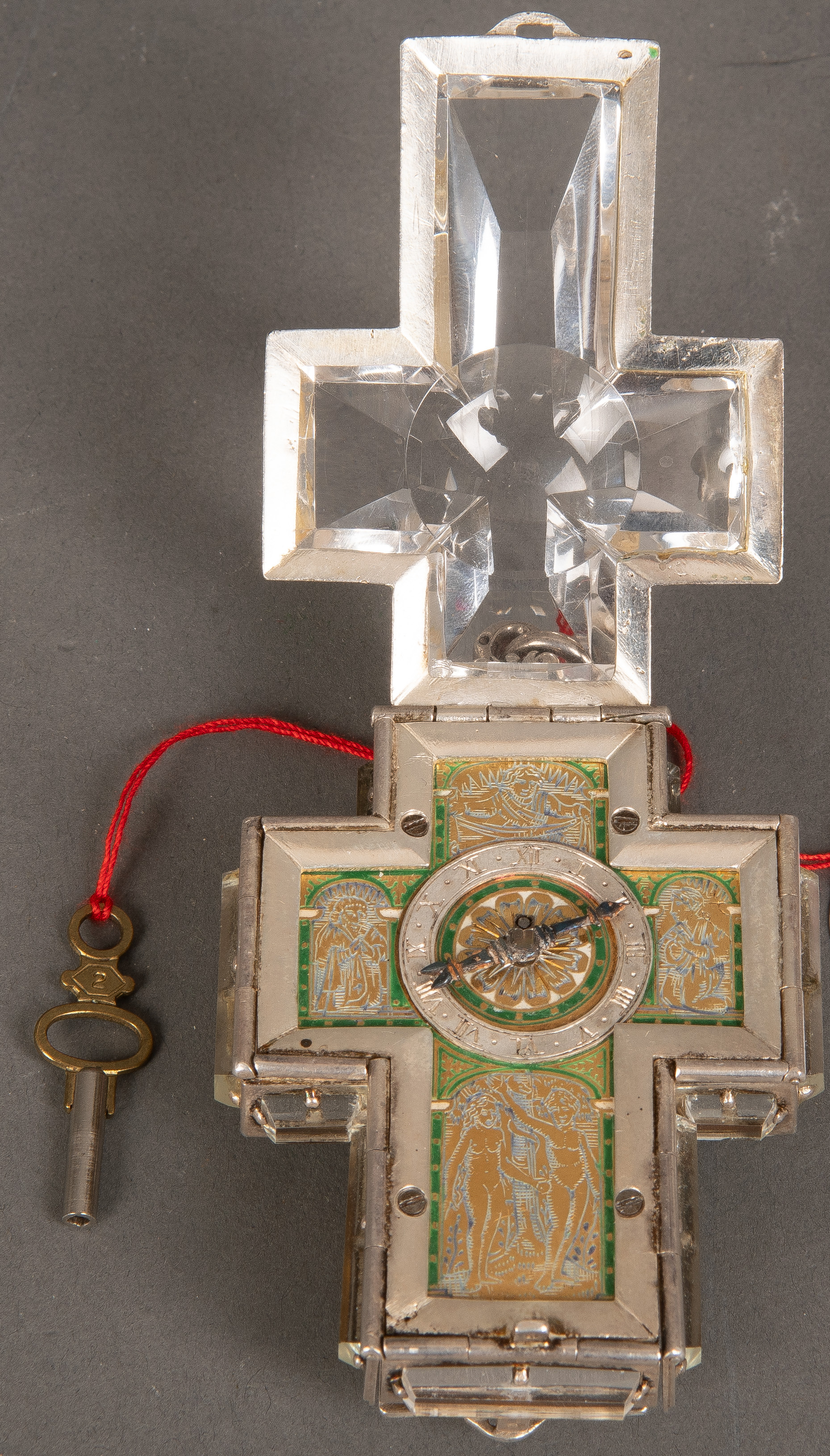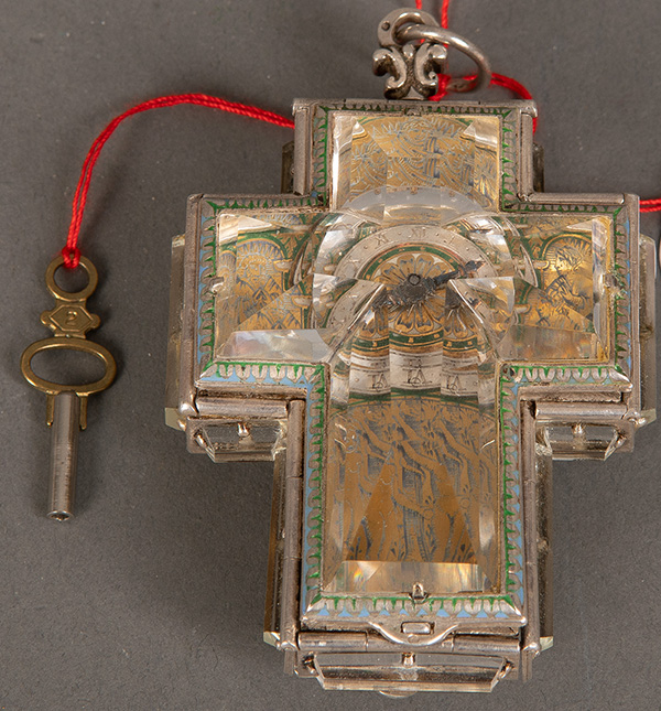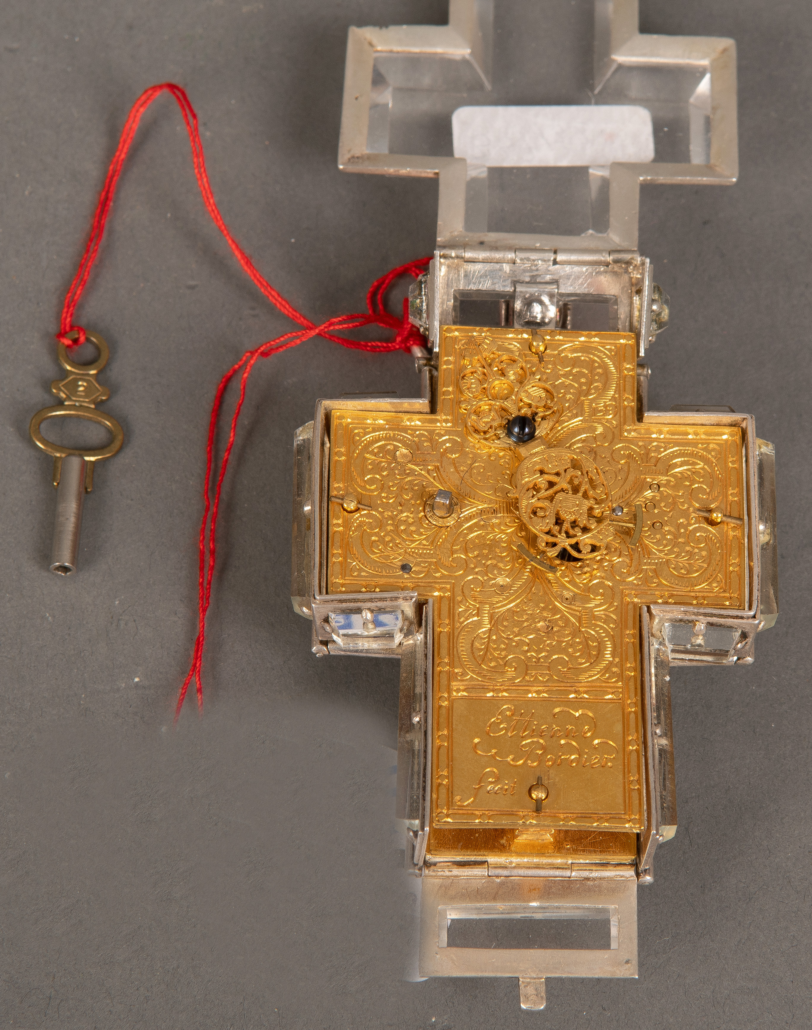 - Katalog-Nr: 425Kreuzuhr. Wohl Frankreich, sign. „Etienne Bordier fecit“. Silbergehäuse, beidseitig aufklappbar, mit Bergkristall, H=7,2 cm, B=5,7 cm, T=3,4 cm. (Funktion ungeprüft)o.L.