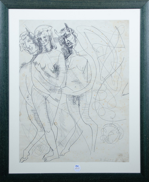 - Katalog-Nr: 401Karl Stachelscheid (1917-1970). Akt und Satyre. Tusche / Bleistift, re./u./sign., mit Passepartout hi./Gl. gerahmt, 62 x 48 cm.o.L.