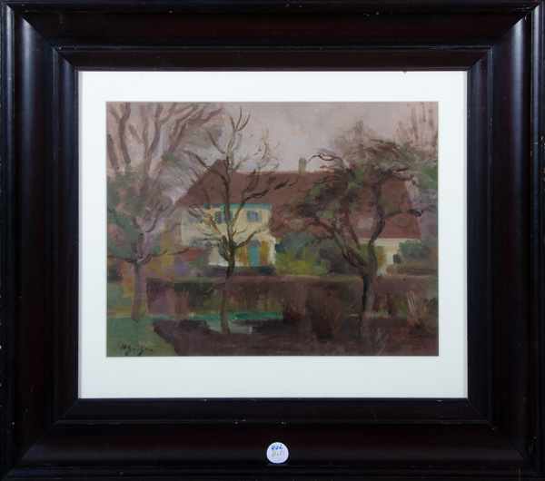 - Katalog-Nr: 402Oleg Zinger (1910-1998). „Heimatdorf“. Mischtechnik, li./u./sign., mit Passepartout hi./Gl. gerahmt, 37 x 47 cm.o.L.