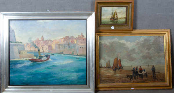 - Katalog-Nr: 405Jacques Hayet (Maler des 20. Jhs.). Fischkutter vor Küste. Öl/Holz, re./u./sign. (20,5 x 28 cm); dazu Maler des 20. Jhs. Küstenlandschaft mit Booten und Personen, Öl/Lw. (50 x 70,5 cm) und Dampfschiff vor orientalischer Stadt, Öl/Lw. (71 x 80 cm). Je gerahmt.o.L.