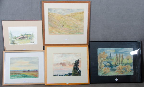 - Katalog-Nr: 406Fünf Aquarelle: Christa Krug (*1945), „Die Burg Giebichstein in Halle“, re./u./sign./dat. 1993, verso beschriftet (37 x 48 cm); Manfred Pietsch (1936-2015), Sommerlandschaft mit Personenstaffage, re./u./sign. (33,5 x 45 cm); Hedwig Holtz-Sommer (1901-1970), Panoramalandschaft, re./u./monogr. (28 x 36,5 cm) sowie zwei weitere Landschaften (22 x 35,5 / 30 x 37 cm). Je hi./Gl. gerahmt.o.L.