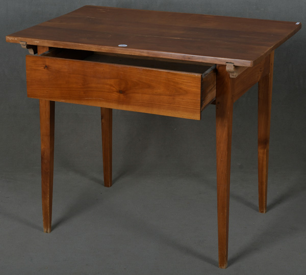 - Katalog-Nr: 410Biedermeier-Tisch. Deutsch 19. Jh. Massiv Kirschbaum; Spitzfüße, einschübiger Tischkasten, überstehende Platte, H=77 cm, B=90 cm, T=62 cm.o.L.