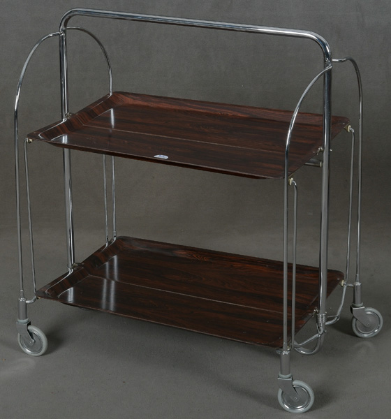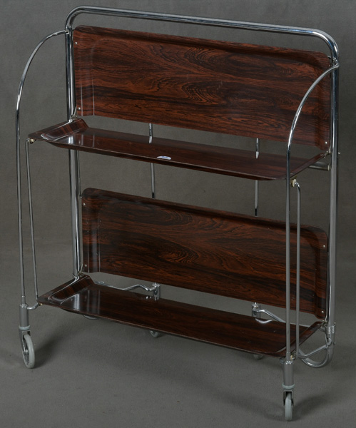 - Katalog-Nr: 411Servierwagen, faltbar. Deutsch 1960er Jahre. Chromgestell / Formica, auf Rollen, H=77 cm, B=68 cm, T=42 / 22 cm.o.L.