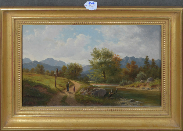 - Katalog-Nr: 412M. Schultze (Maler des 19. Jhs.). Flusslandschaft mit Personenstaffage am Weg und Gebirgszug. Öl/Lw., re./u./sign., gerahmt, 28,5 x 45,5 cm.o.L.