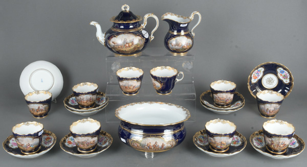 - Katalog-Nr: 42013-tlgs. Prunkservice. Meissen 19. Jh. Porzellan, mit kobaltblauem Fond, Goldspitzenbordüren und -kartuschen. Reserven exzellent bunt bemalt mit Schäferszenen in Landschaft, verso bunt bemalt mit Blumenbouquet. Am Boden unterglasurblaue Schwertermarke. Bestehend aus: Eine Teekanne (H=17 cm), ein Milchgießer (H=14,5 cm), eine große runde Kumme (H=10,5 cm, D=22,5 cm) und zehn Tassen mit Unterschalen.o.L.