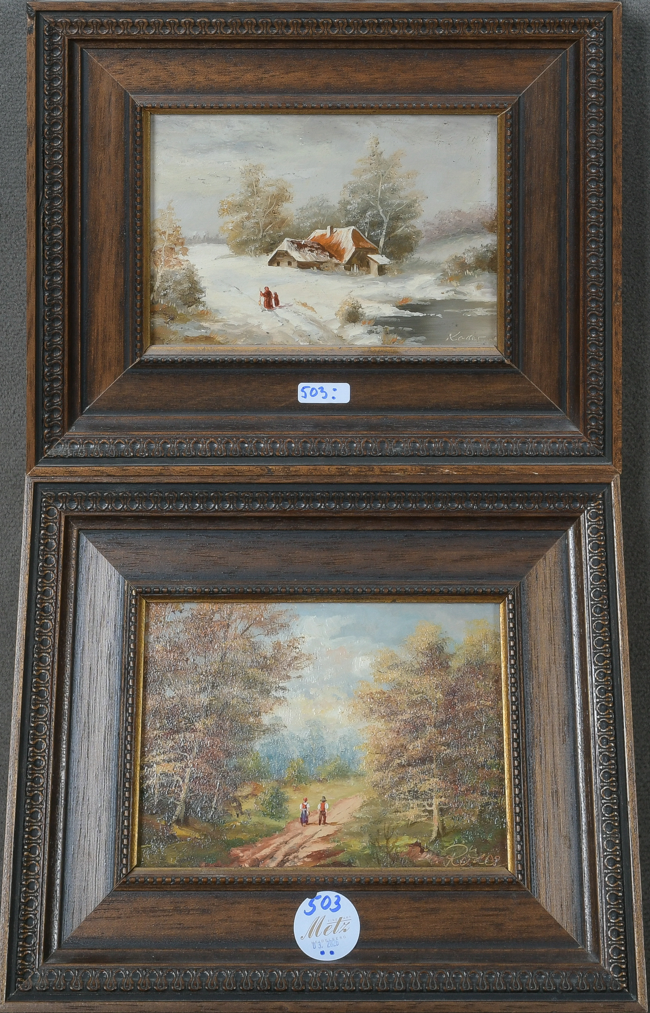 - Katalog-Nr: 503Klaus Wäschenfelder (*1923). Zwei Ansichten von „Pfalzgrafenweiler“. Öl/Sperrholz, verso mit Klebeetikett, bez./dat. 1980, gerahmt, je 13 x 18 cm.o.L.