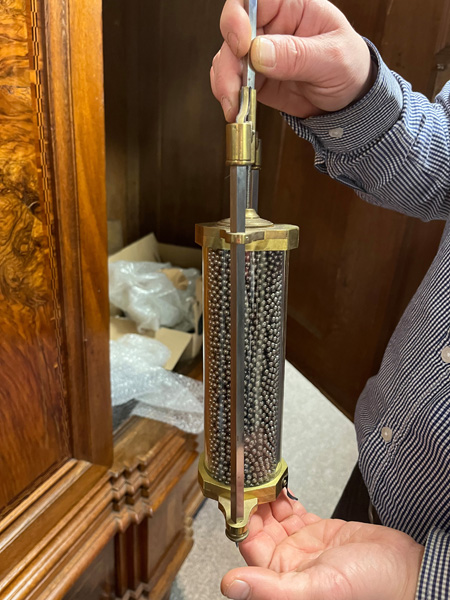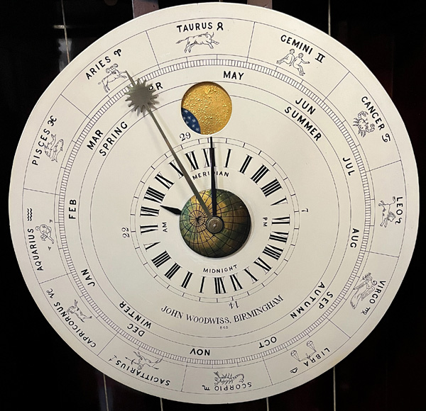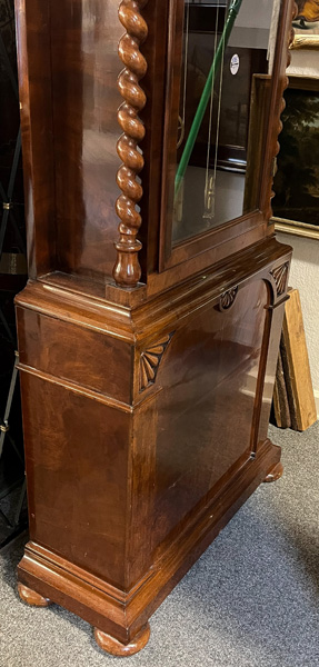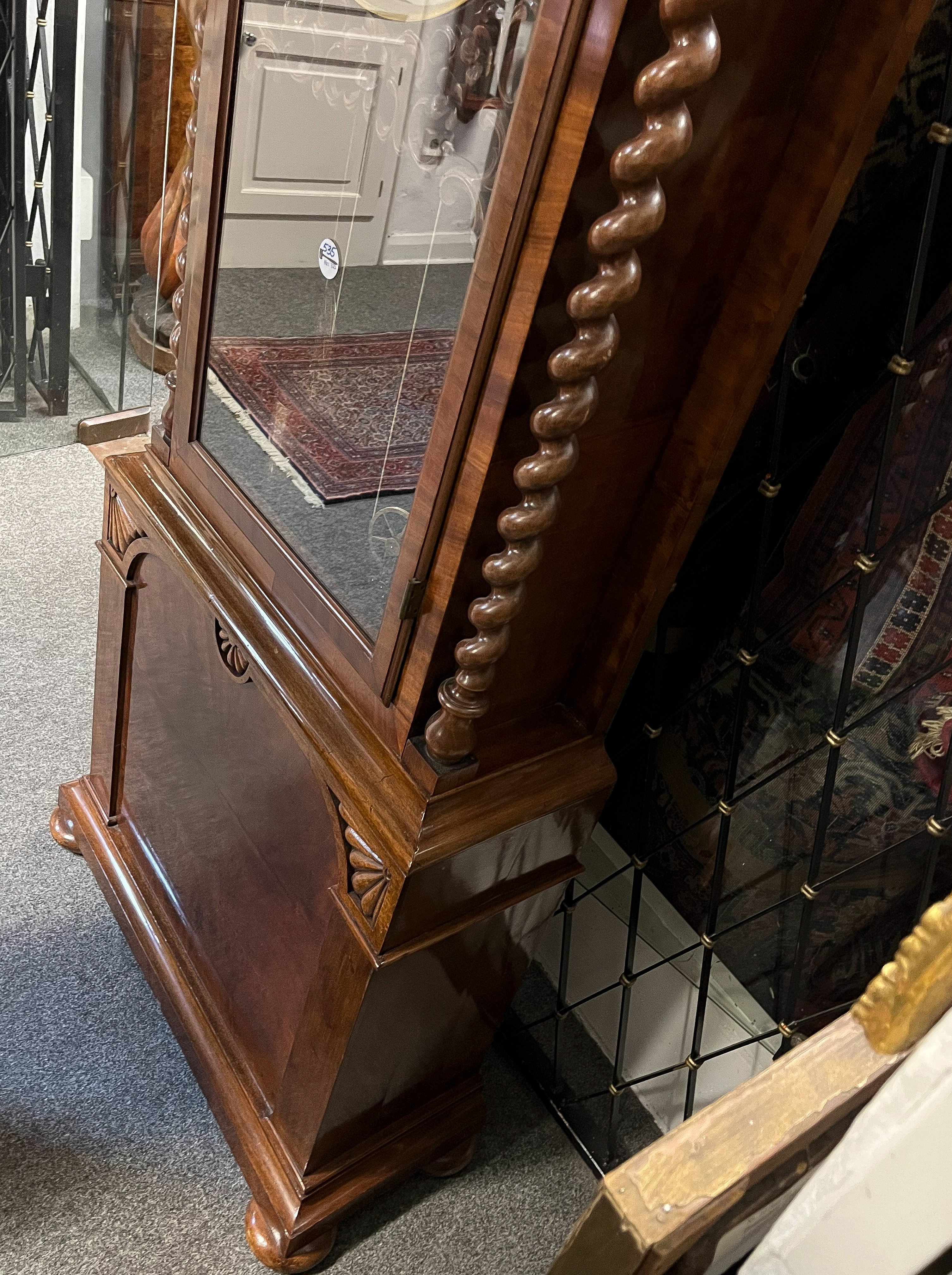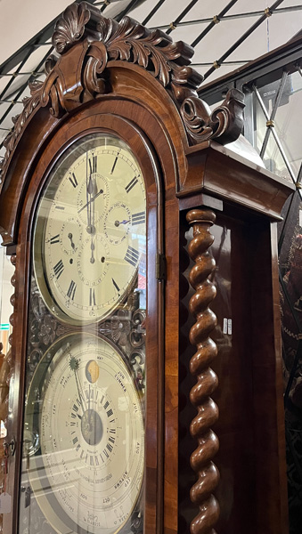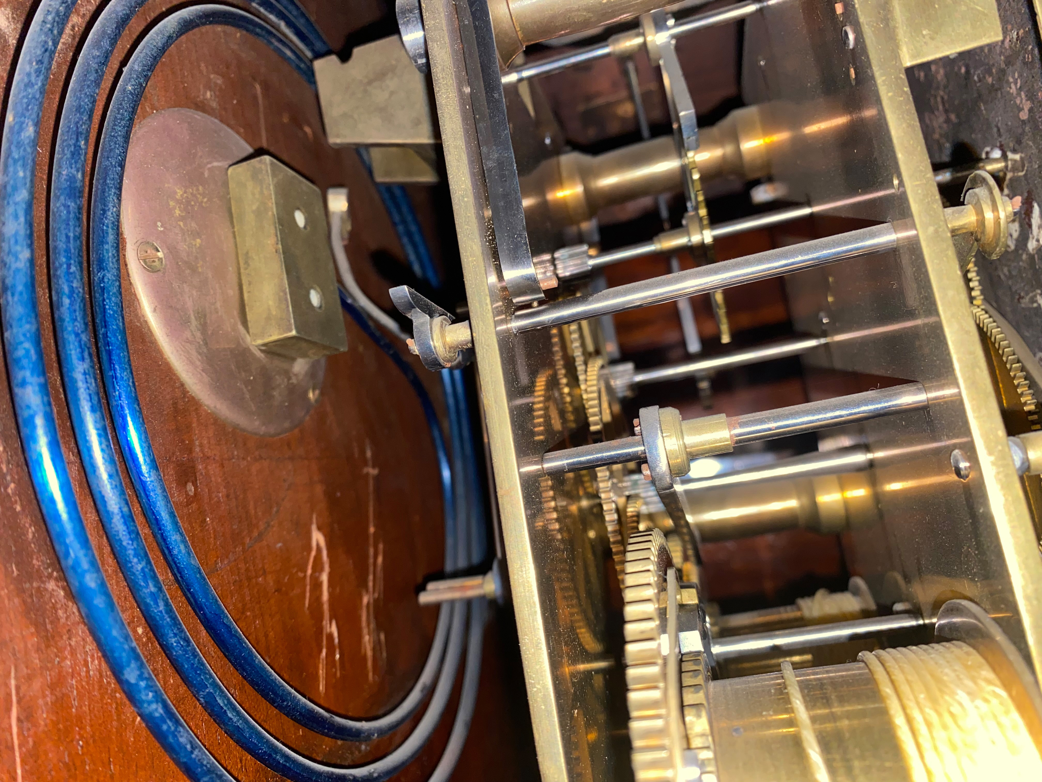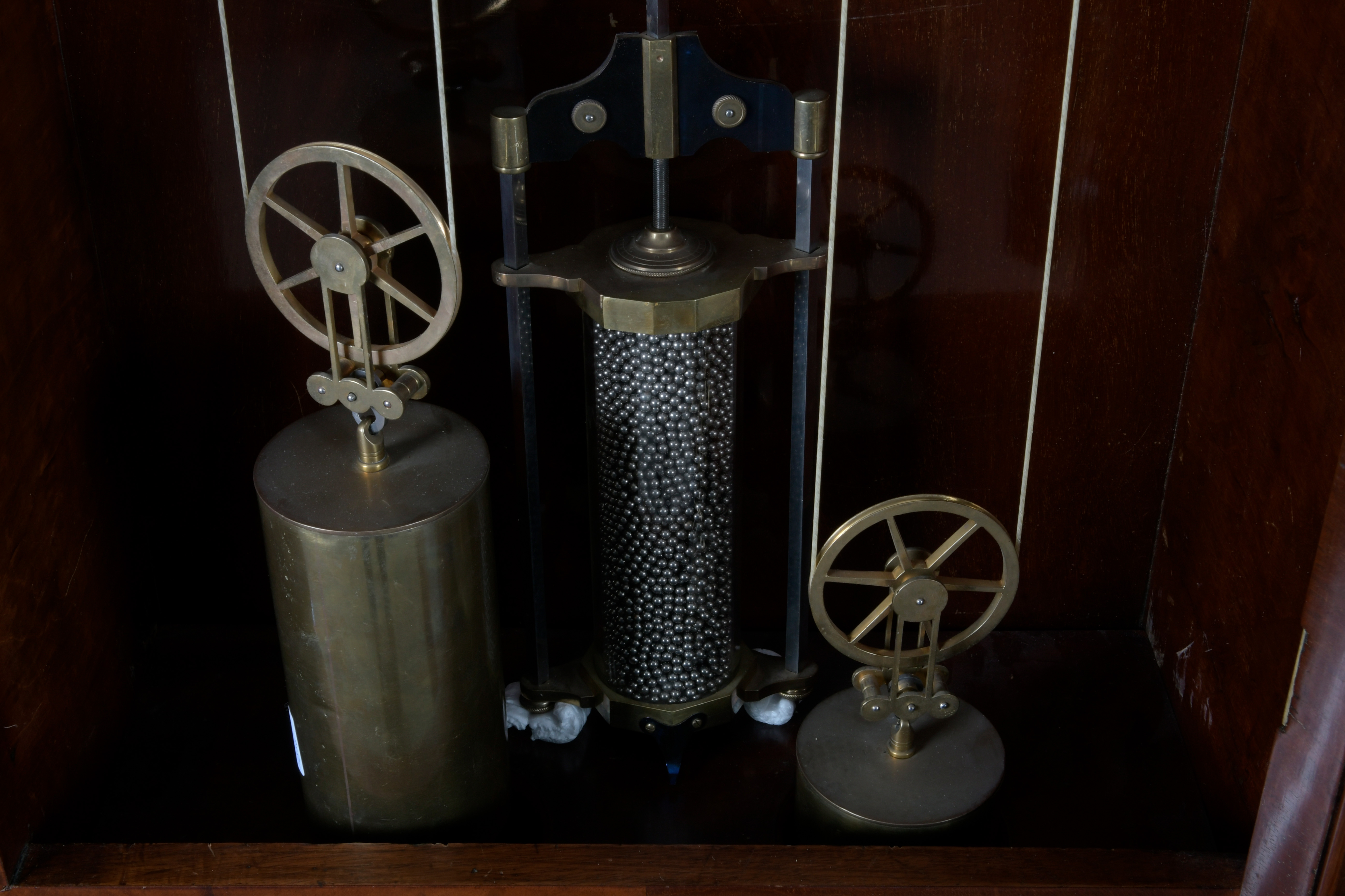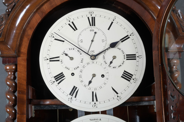 - Katalog-Nr: 505Musealer Präzisionsregulator-Monatsläufer. Birmingham, Meister John Woodwiss dat. 1862. Mahagoni furniert, teilw. massiv und geschnitzt. Hochrechteckig, auf Kugelfüßen mit quaderförmigem Sockel und verglastem, gewölbtem Uhrenkasten mit verschlungenen Blättern, Muschelverzierungen und spiralförmigen Säulen. Der Regulator weist insgesamt 11 Funktionen auf: Das obere Ziffernblatt mit regulärer Minuten- und Stundenanzeige, plus separate Anzeigen für Sekunden, Datum, Wochen- und Monatstag. Das untere Ziffernblatt mit äußerem jährlichen Kalenderring (mit Jahreszeiten und Tierkreiszeichen), plus separate Anzeigen für Mondphase und -daten, Tages- und Nachtanzeige und eine separate Globusanzeige, sign./dat. Effektive 5-Säulen-Drehung, mit träger Hemmung, verzierter Drehscheibe, Quecksilberpendel mit Drehspannung und kristallenem Glas, doppeltem Gewichtlaufwerk mit gleichbleibender Energie, 5-rädiges Laufwerk mit großen Getriebezahnrädern und 6-zackigen Zahnrädern, durchgehender Schlag zur Stunde mit einem Gong und zur Viertelstunde mit einem Klingeln, Gestänge mit Getriebegangschaltung zum Kalendermechanismus, H=225 cm, B=67 cm, T=26,5 cm. Provenienz: Richard Redding, Zürich SFR 45.000,00. (Funktion ungeprüft)o.L.