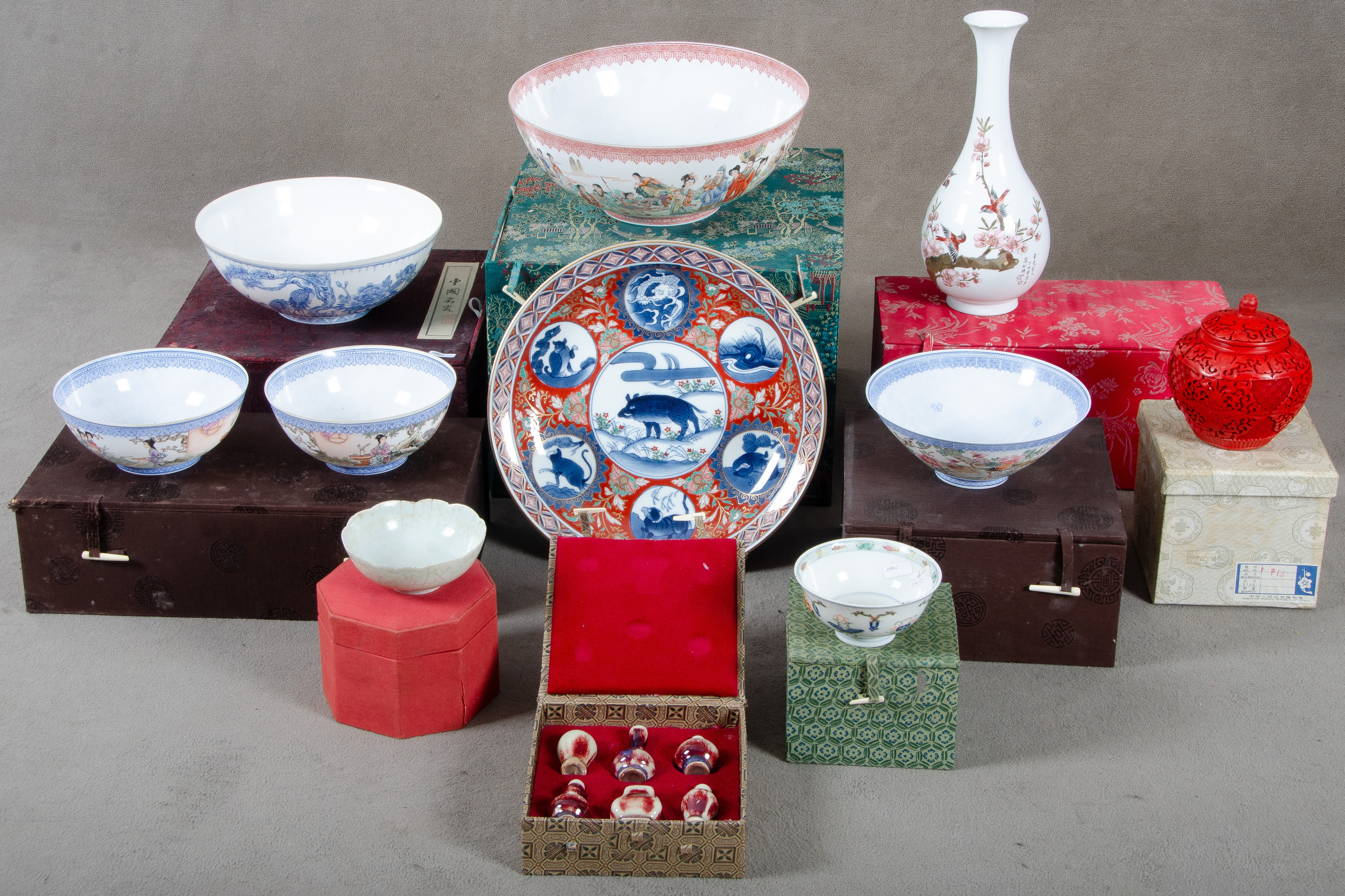 - Katalog-Nr: 506Zwölftlgs. Konvolut Asiatika: Sieben Porzellanschalen, bunt bemalt (H=4,5 bis 11 cm, D=11,5 bis 28 cm) im Etui, zwei Miniatur-Vasen (H=5 / 6 cm), eine Rotlack-Deckeldose (H=13 cm, D=11 cm), ein Teller (D=30 cm) und eine Vase (H=28 cm). (besch.)o.L.