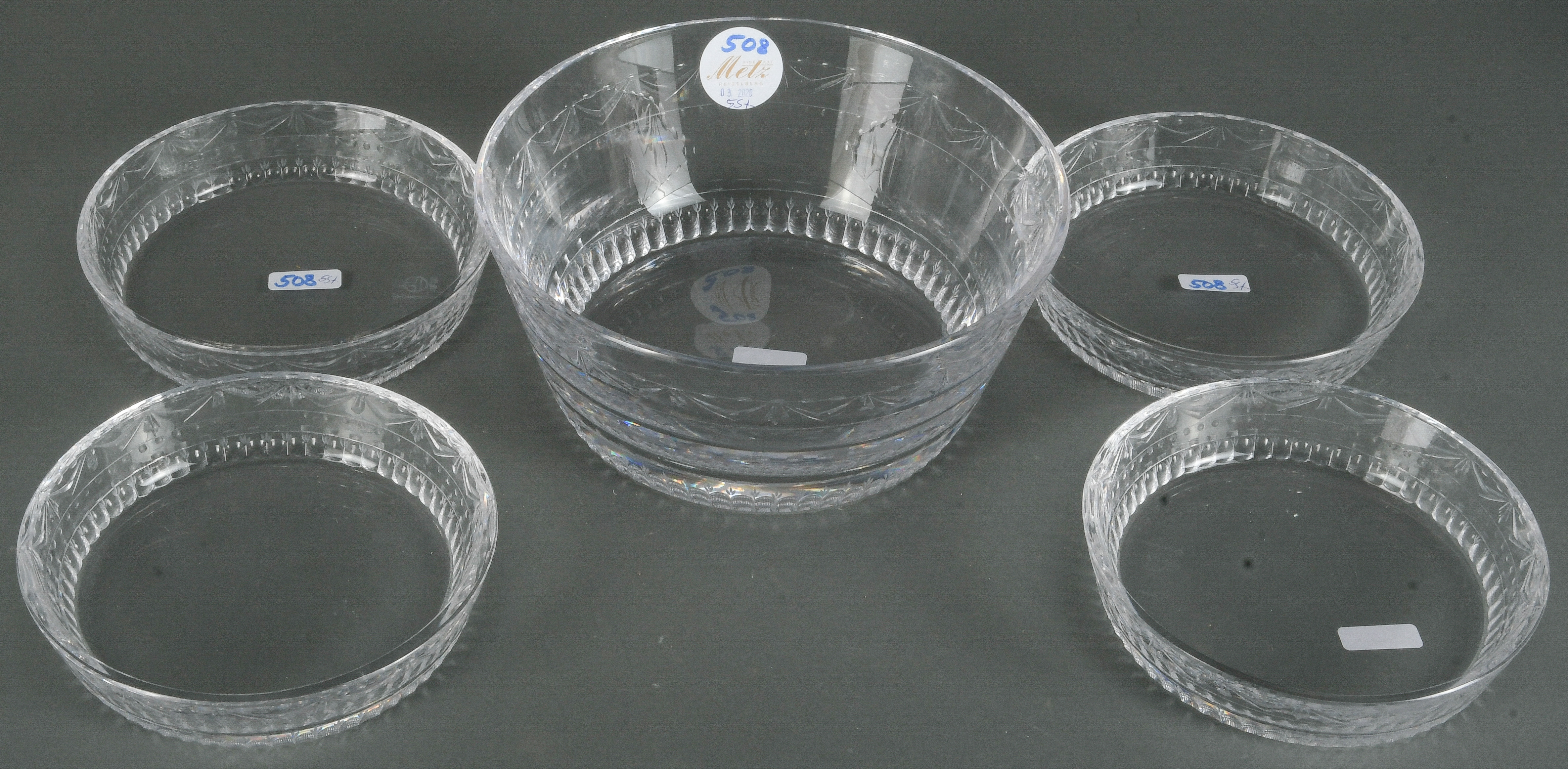 - Katalog-Nr: 508Fünftlgs. Konvolut Schalen „Kurlandmuster“. Berlin 20. Jh. Farbloses Glas, geschliffen; am Boden gemarkt, H=8,5 cm, D=19,5 cm (große Schale).o.L.