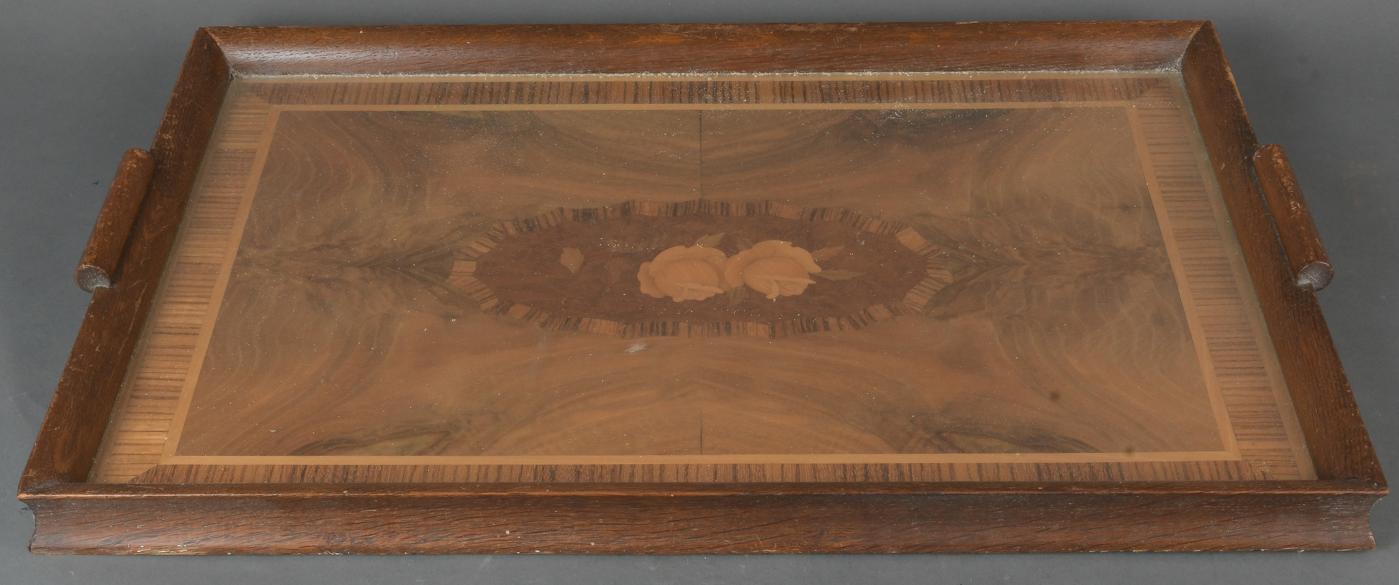 - Katalog-Nr: 513Rechteckiges Serviertablett. Deutsch um 1900. Massivholz, floral marketiert, mit aufliegender Glasplatte, H=4,3 cm, B=56,5 cm, T=38 cm.o.L.