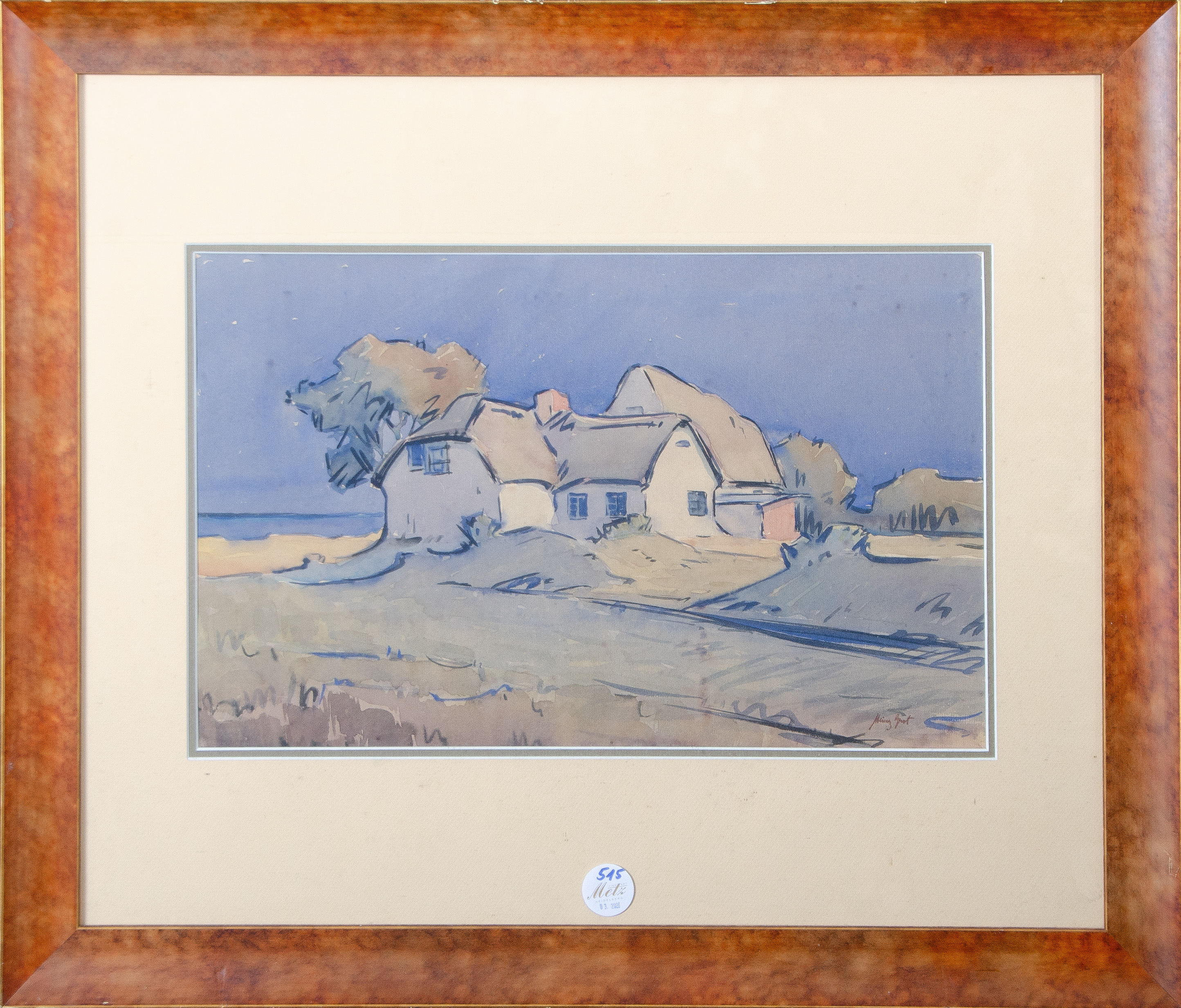 - Katalog-Nr: 515Heinz Grot (1901-1995). „FISCHERHAUS b. NIEBLUM a. FÖHR“. Aquarell/Karton, re./u./sign., mit Passepartout hi./Gl. gerahmt, 50 x 60 cm.o.L.