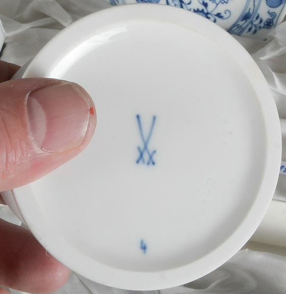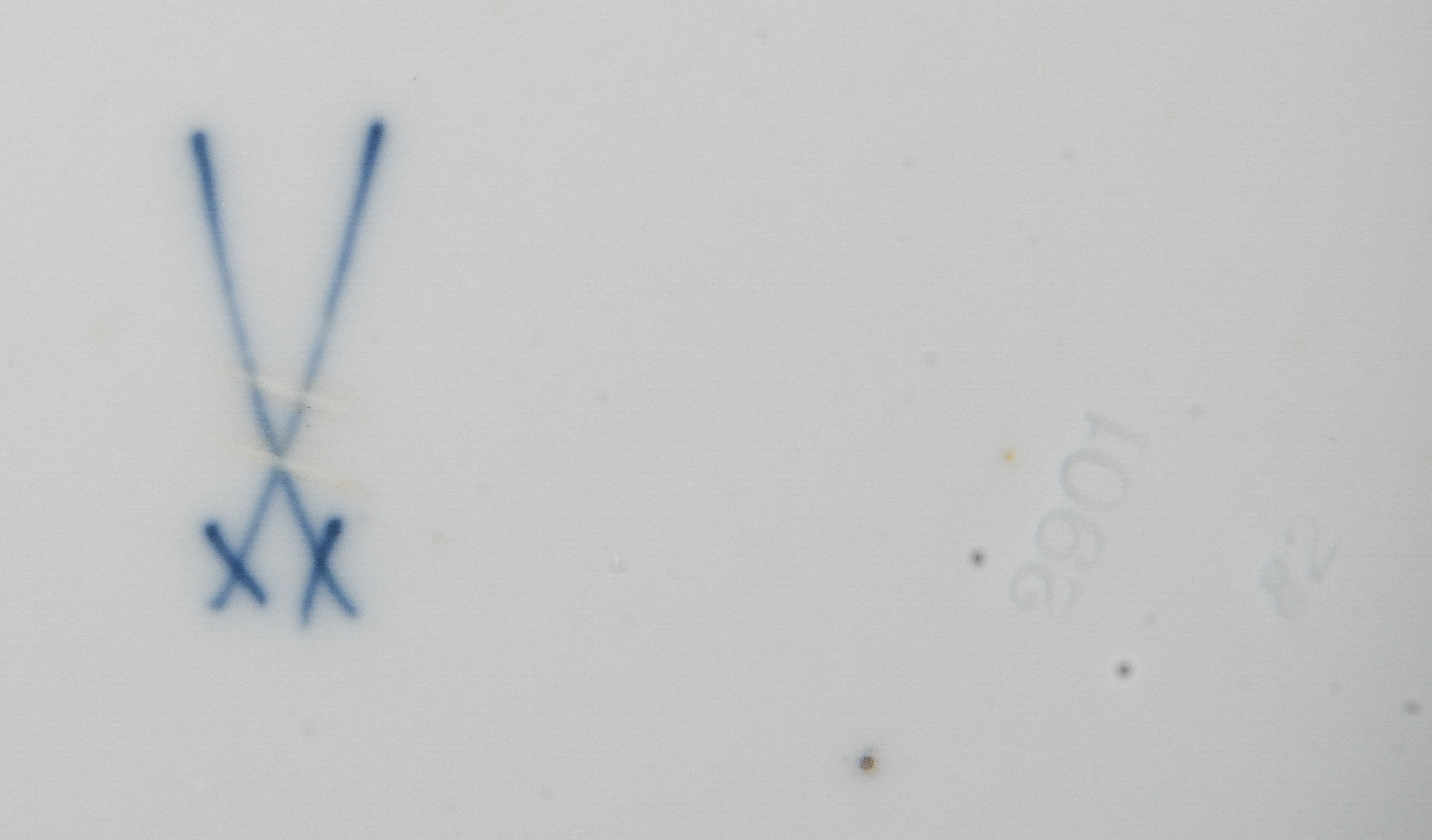 - Katalog-Nr: 517Siebentlgs. Konvolut „Zwiebelmuster“. Meissen 20. Jh. Porzellan, unterglasurblau bemalt; am Boden unterglasurblaue Schwertermarke. Bestehend aus: Ein Kerzenleuchter (H=6,5 cm), eine Zuckerdose (H=7,5 cm), ein Teller (D=14,5 cm) und vier Mokkatassen mit Unterschalen. Alle Teile im Original-Karton, H=10,5 cm, B=37,5 cm, T=25 cm / H=12 cm, B=43 cm, T=25,5 cm.o.L.
