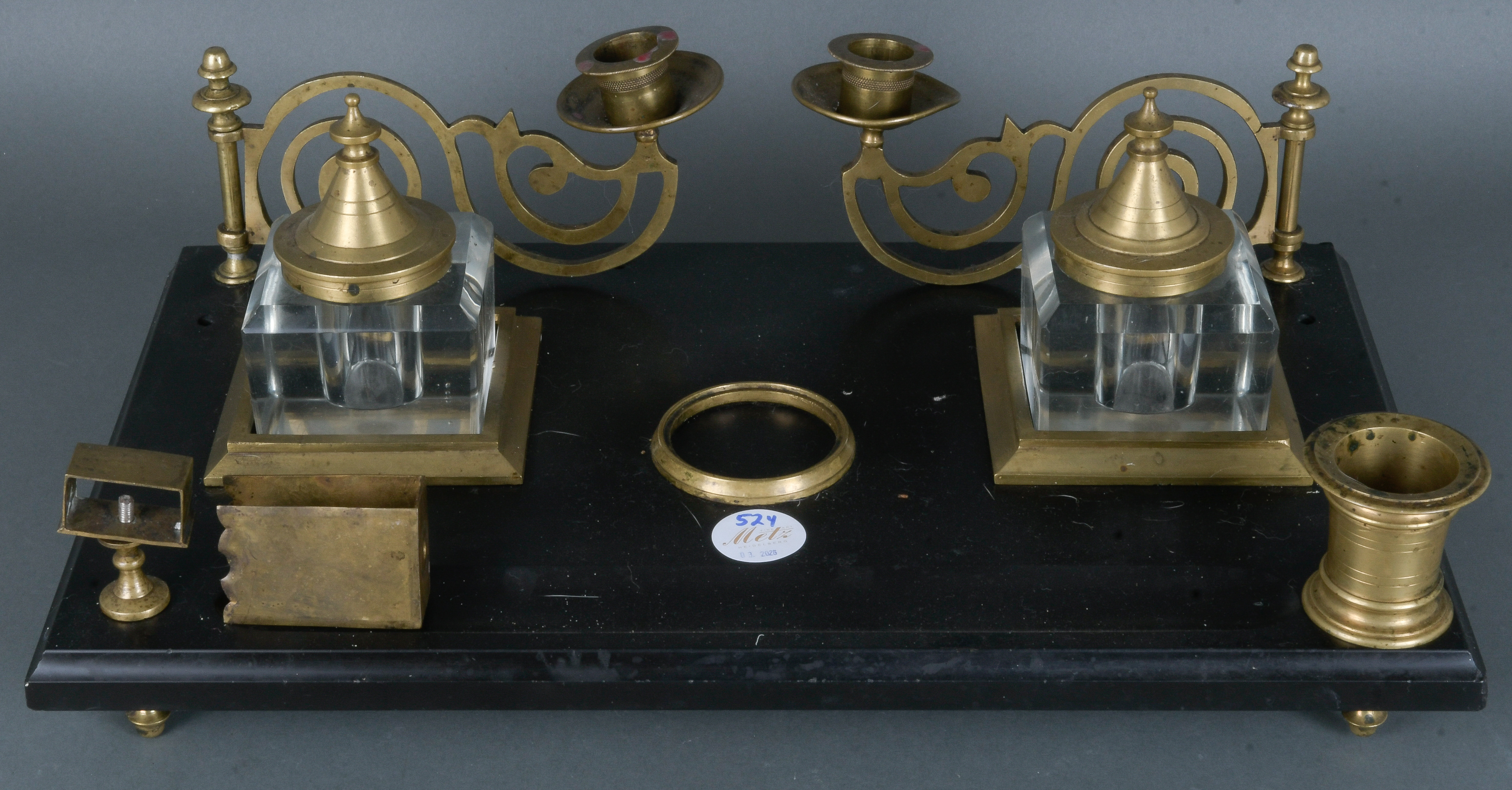 - Katalog-Nr: 524Schreibtischgarnitur. Deutsch um 1880. Große schwarze Marmorplatte mit einem Paar Armleuchtern (befestigt und schwenkbar), gläsernen Tinten- und Streusandgefäßen, Streichholzhalter und walzenförmigen Gefäß, H=14 cm, B=44 cm, T=26,5 cm. (Teile fehlen)o.L.