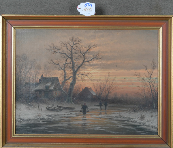 - Katalog-Nr: 504Georg Schmitz (1851-1917). Winterlandschaft mit Personenstaffage und Gebäude. Öl/Lw., li./u./sign./bez. „Hamburg“, gerahmt, 24,5 x 32,5 cm.o.L.