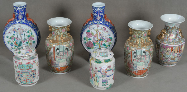 - Katalog-Nr: 507Zwei Deckelgefäße und fünf Vasen. Asien. Porzellan, bunt bemalt, teilw. gold überdekoriert, H=29 bis 45,5 cm.o.L.