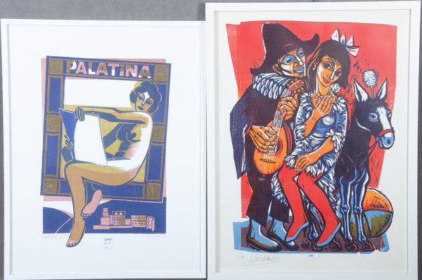 - Katalog-Nr: 514Heinz Friedrich (1924-2018). „Palatina“. Farbholzschnitt 14/75, re./u./sign./dat. (19)94 (49,5 x 33 cm); dazu Walter Habdank (1930-2001). Mandolinenspieler mit Eselreiterin. Farbholzschnitt 44/100, li./u./sign./dat. (19)81 (61 x 42 cm). Je hi./Gl. gerahmt.o.L.