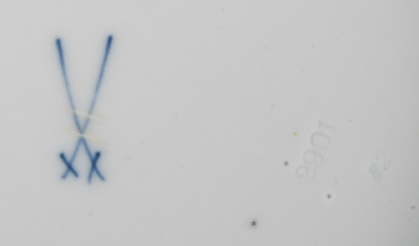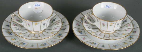 - Katalog-Nr: 516Paar Gedecke. Fürstenberg 20. Jh. Porzellan, bunt bemalt mit Streublumen, Goldrand; am Boden gemarkt, D=19,2 cm.o.L.