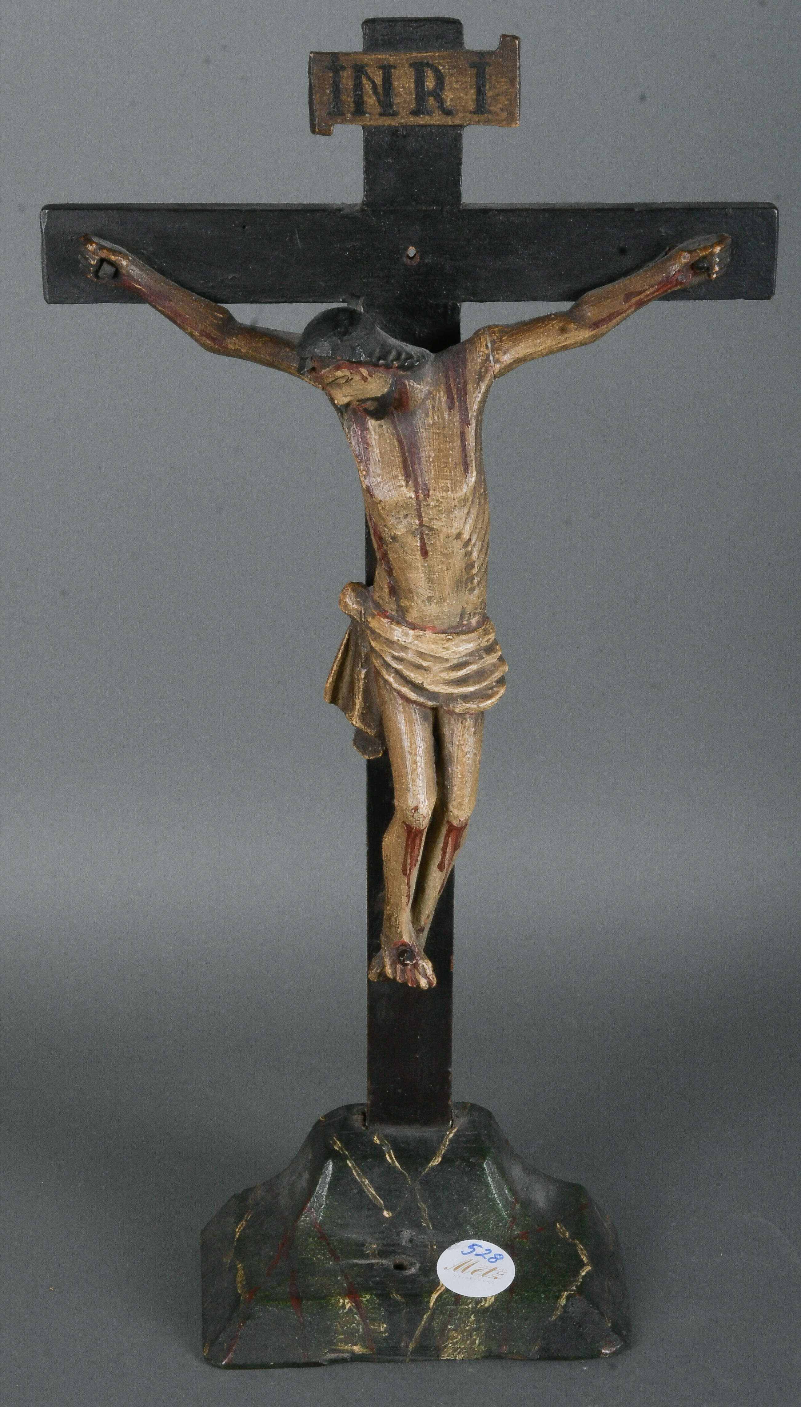 - Katalog-Nr: 528Kruzifix. Süddeutschland 19. Jh. Massivholz, geschnitzt, auf Kreidegrund farbig gefasst, H=49,5 cm.o.L.
